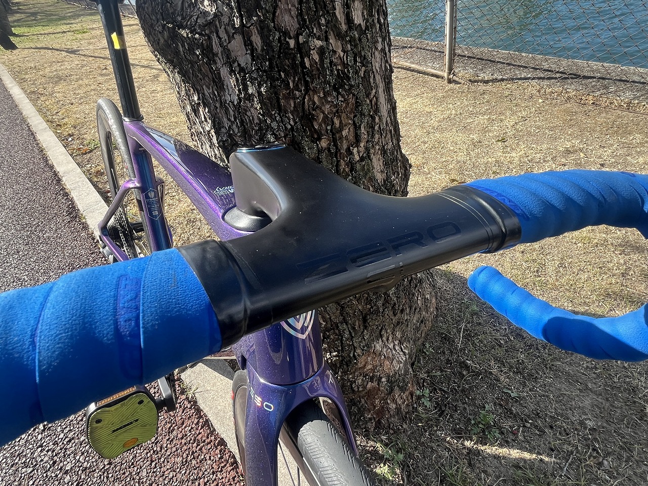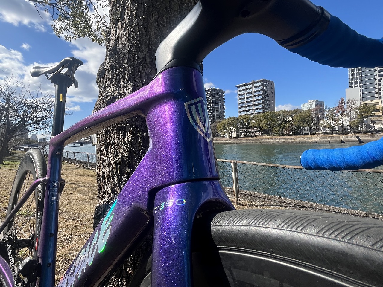 ハンドルに力を掛けてステアリングを切ると、まるでバイク全体が一塊の“剛体”として回転するような感触があります。俗に言う「ジャイロ感」が強烈です。コーナリングやダンシングでの力の伝達が非常にリニアで、フロントエンドが暴れることなく狙ったラインをトレースしてくれます。平坦や高速域ではこの高剛性が巡航安定性を生み、踏み込むたびにスピードが“乗る”感触が心地良い。反面、路面の細かい凹凸を踏んだ瞬間の振動はややダイレクトに手元へ伝わりやすい部分もあり、いわゆるエアロバイクらしい「硬さ」はありますが、その代わりに高速域の安定感と加速感は抜群です。