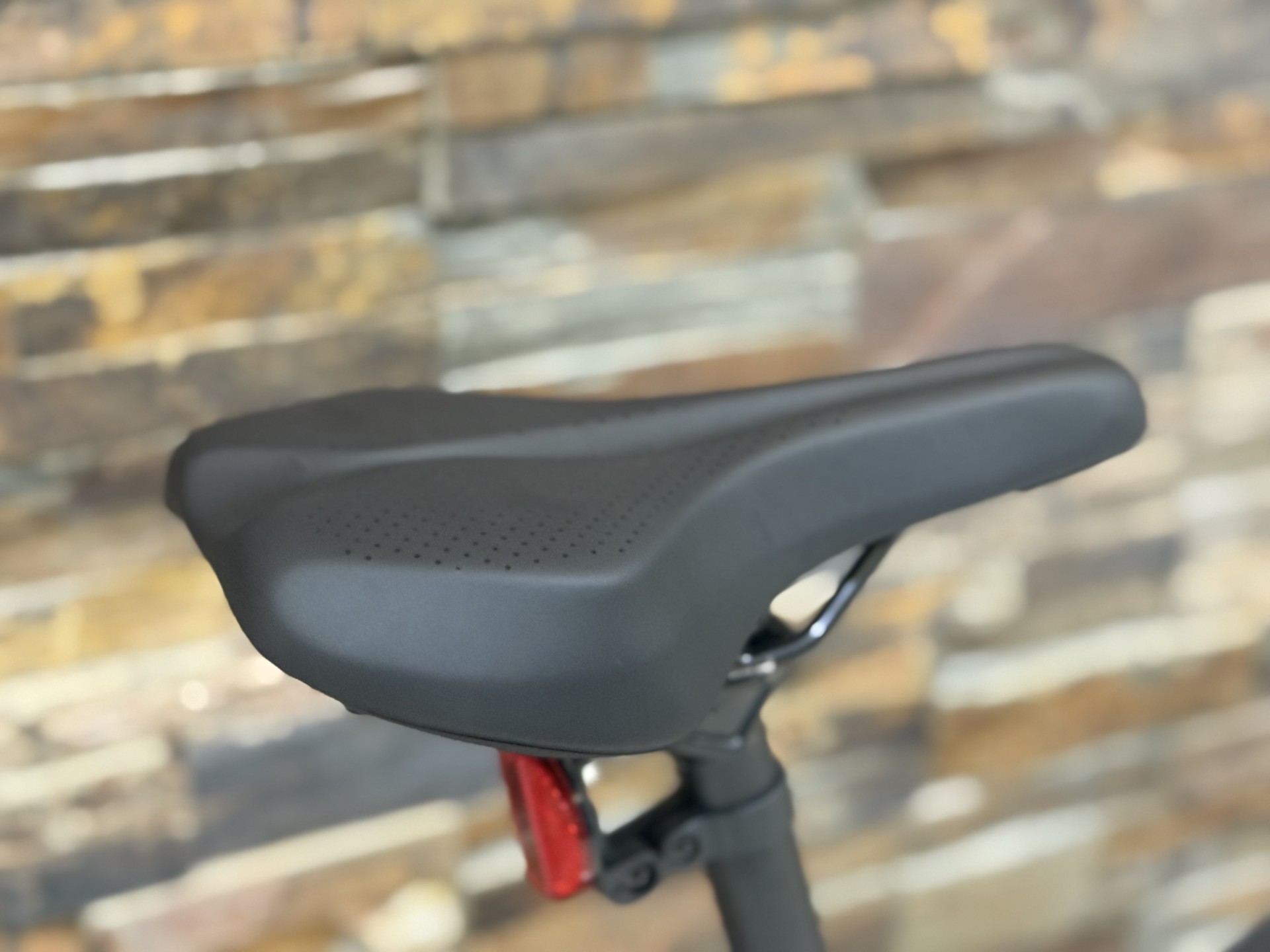 標準装備されているサドルは、Trekの純正ブランドBontrager H1です。車体との相性も良く、フィットネスからクロスユースまで幅広く使える万能タイプのサドルです。長時間でも疲れにくい形状で、街乗りやフィットネスライド、軽めのロングライドまで対応します。広めの座面設計なため安定感があり、アップライトなポジションでも体をしっかりと支えてくれるのが特徴です。