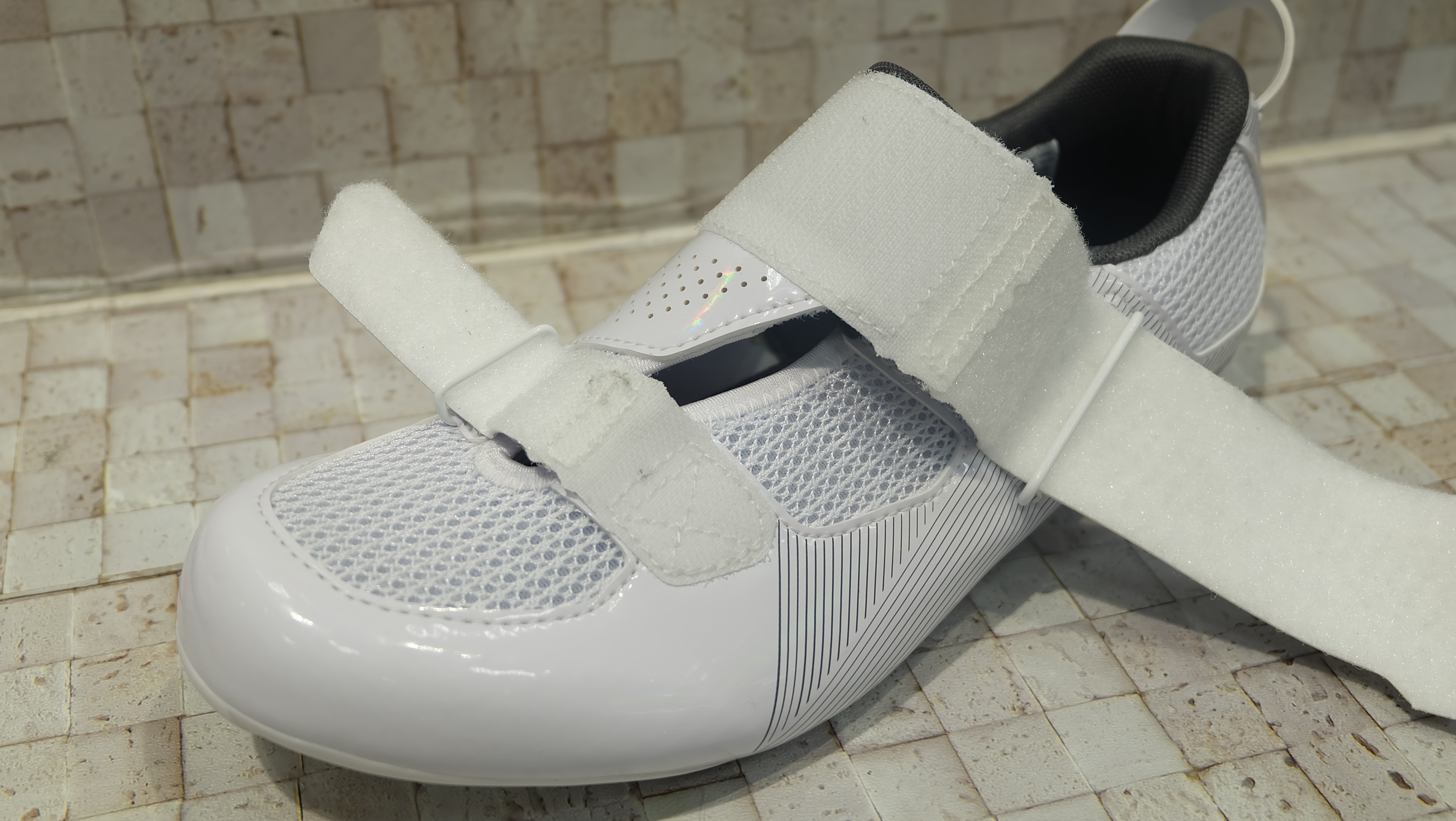 トライアスロンというばトランジションの速さが大事になってきます。TR5はトランジションの速さを大切にしており、大きく開くストラップ構造を採用しています。調整はマジックテープ仕様になっており、片手で素早く調整できます。