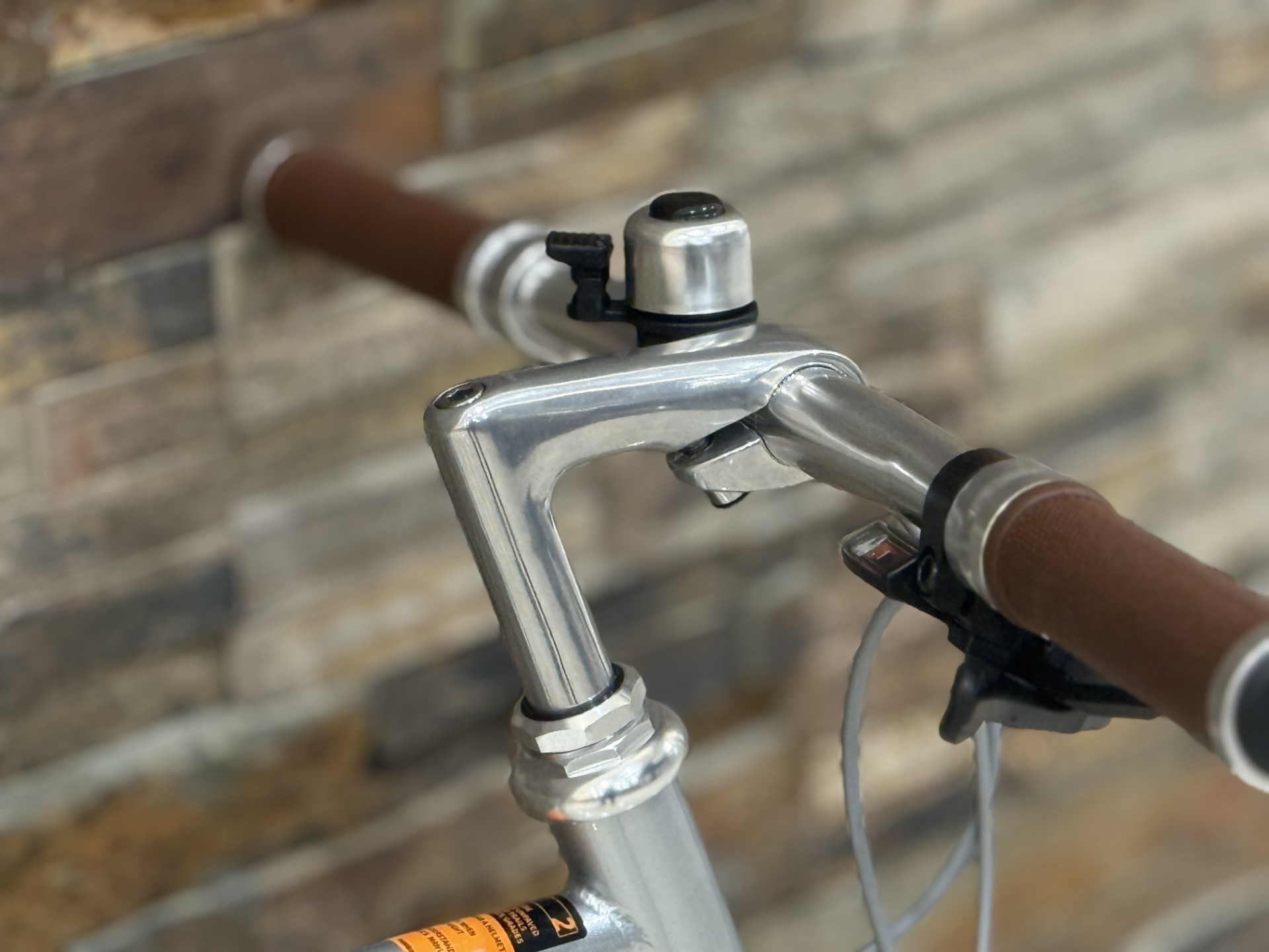 また、駆動部はシルバーパーツで統一され、ポリッシュ仕上げのブレーキレバーがクラシックな雰囲気をさらに引き立てます。アウターケーブルも車体カラーに合わせており、全体のバランスが取れた仕上がりです。ブラウンのグリップが程よいアクセントとなり、細部までこだわりを感じられる仕様となっています。