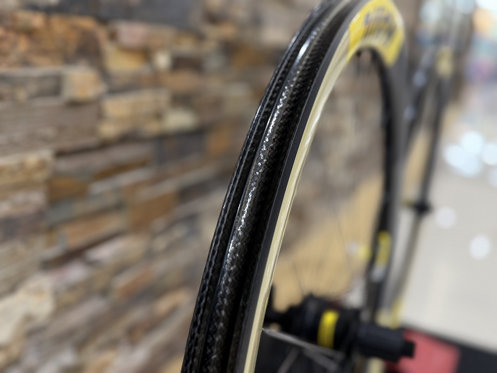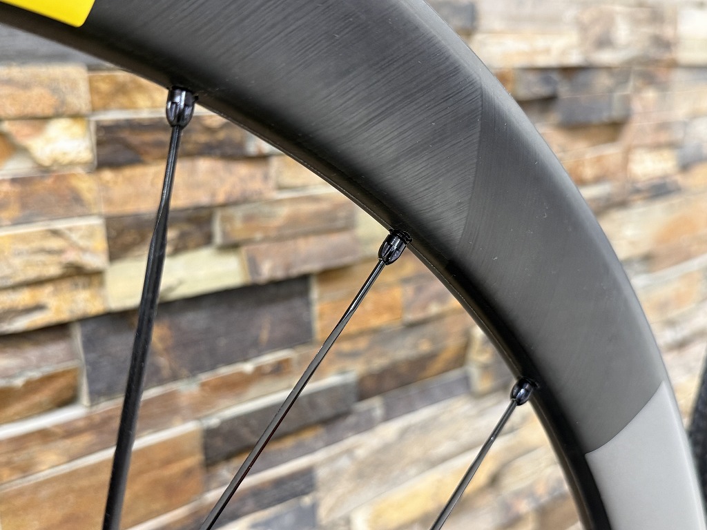 COSMIC SLRは剛性・軽量性に優れており、なぜかというとマヴィック独自技術の「CARBON FORE」にあります。これはリム成形時にあらかじめ外ねじ式ニップルを装着するインサートを内側に固定することで、10%軽量化に成功し、尚且つ高い剛性に高耐久を実現しました。そしてもう一つの魅力としてリムテープが不要という事です。そして重量も1,482gと軽量なので全体的なバランスもとれているホイールになります。