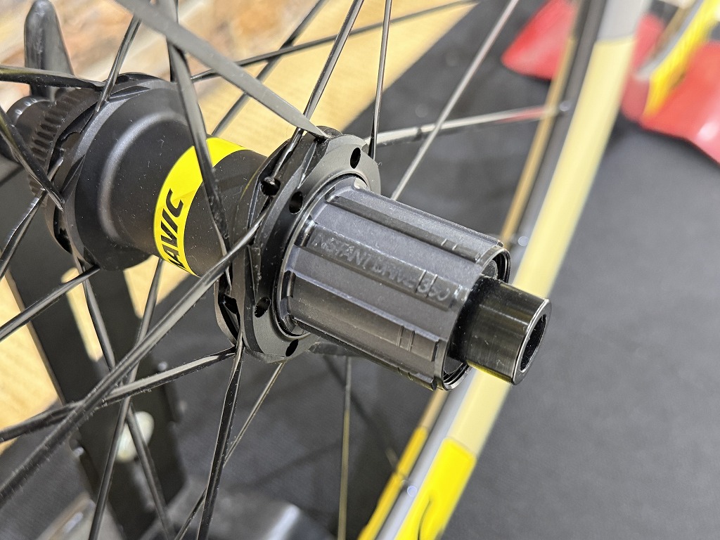 MAVICならではのハブ。摩擦抵抗が減り、効率的なパワー伝達と高耐久を実現。そして、工具無しでスプロケットがついたまま手で引っ張るだけで、内部のメンテナンスが容易にできます。MAVICはメンテナンス頻度を1000㎞に一回、雨の日にライドした後などのタイミングでメンテナンスを推奨しています。