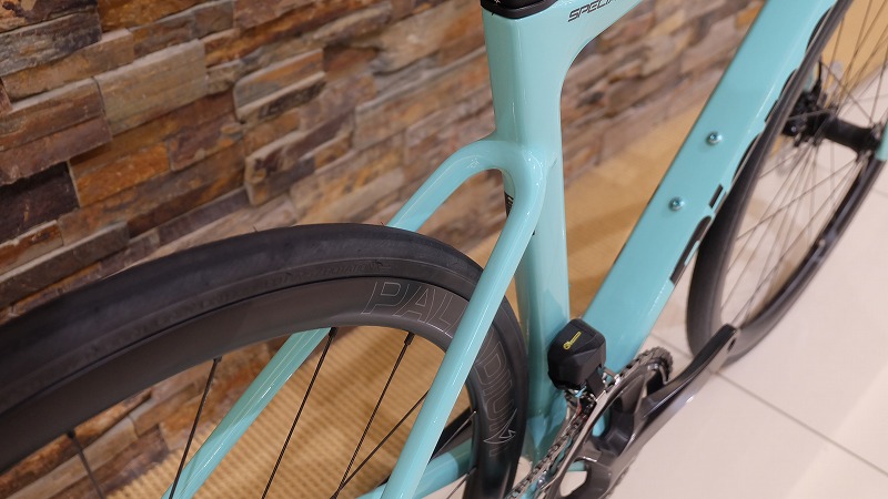純正からついているホイールなのですが、純正と言えば重たいホイールがついてくるなど思われると思います。ですがSPECIALISSIMAは最初から軽量カーボンホイールのVELOMANN PALLADIUM 33㎜がついてきます!重量は前後1,460gで、ハイトは33㎜になっています。山が多い広島ではヒルクライムなどがありますので魅力的な一台になっています。