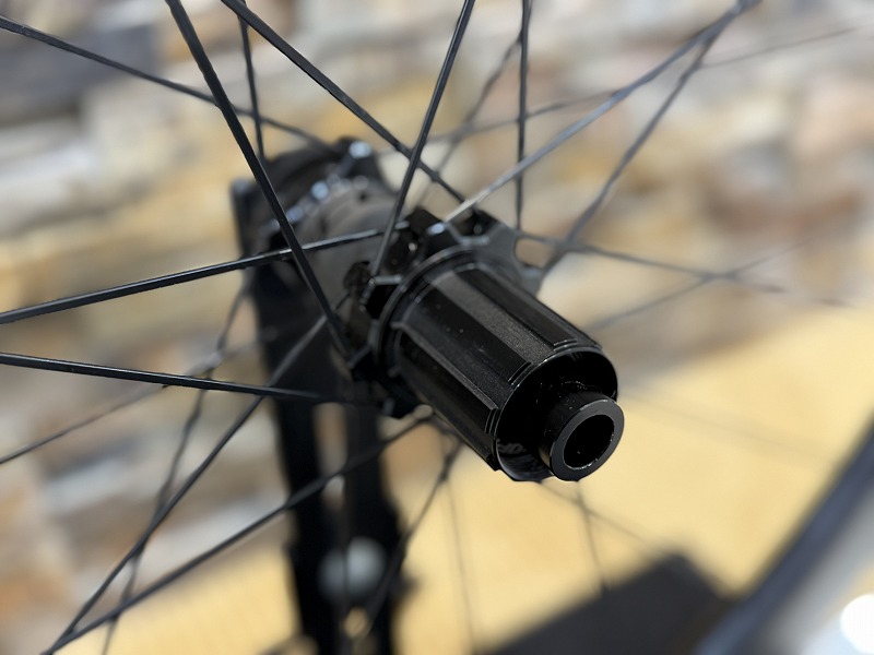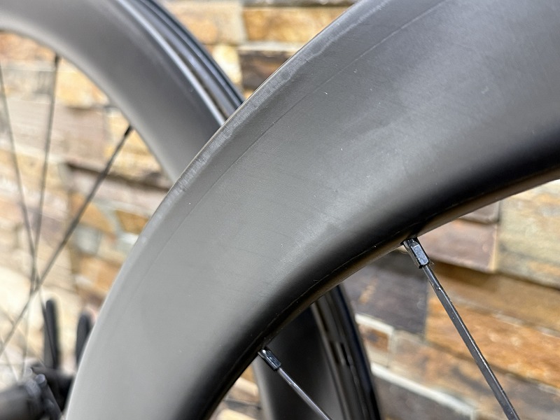 カーボンならではの少し見えるカーボン柄に少し扁平になってるスポーク。カーボンホイールのかっこよさも兼ね合わせ中二心くすぐられるホイールになっています。