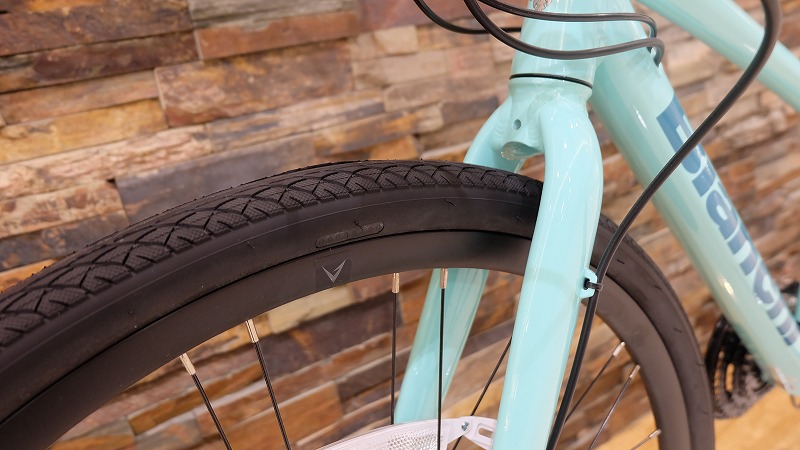 クロスバイクでは最大級の太さ38cというタイヤを標準装備。安全面からこの自転車を選ぶ方も多いことから、みなさんスポーツバイクのスピードや段差の乗り上げを想定してくださっています。太いタイヤは曲がる時も安心で、特に小学生の頃から乗り始める方もいらっしゃるので、親御さん的にもこのくらい太いタイヤであればと仰る方もおられます。