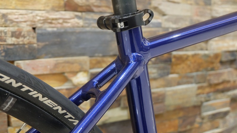 まず注目したいのがフレームです。STRAUSS DISCはフルカーボンではなく、高品質なアルミフレームを採用しています。トリプルバテッド加工が施されたアルミ素材を使用し、部位ごとに最適な剛性としなやかさを持たせることで、軽快な走りと安定感を両立しています。ディスクブレーキ専用設計のため、制動時のフレーム剛性が高く、下りや雨天時でも安心してブレーキングできる点は大きな魅力です。溶接処理も丁寧で、アルミフレームながら見た目の質感が高く、所有感をしっかり満たしてくれます。