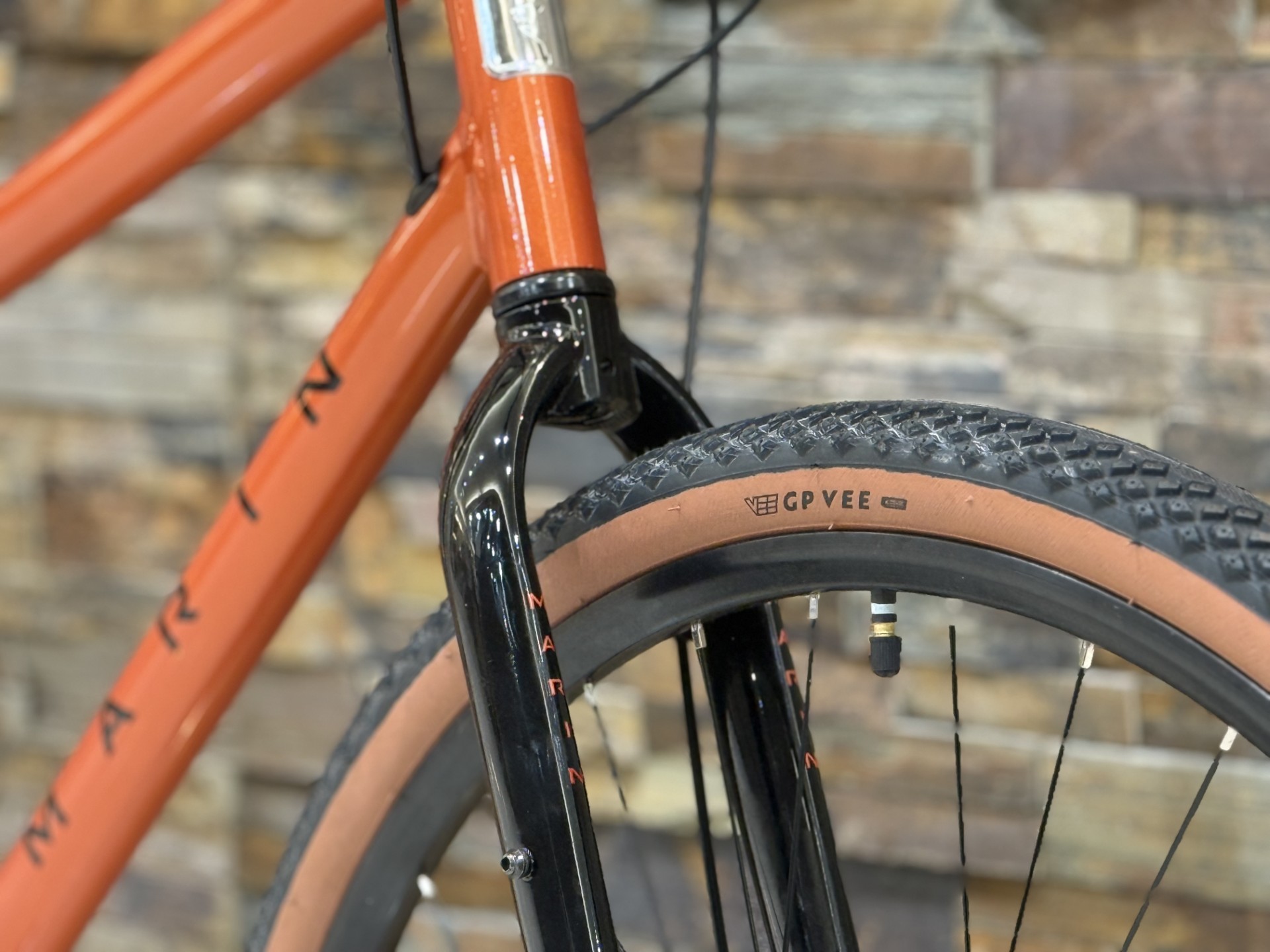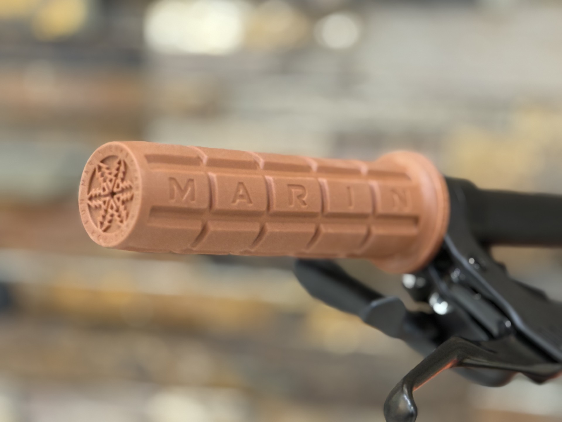 MARINのロゴが刻印されたブラウンカラーのグリップは、スキンサイドなタイヤとフレーム、非常にバランスが良く見えます。程よい太さとブロック状のパターンが手に自然になじみ、街乗りからロングライドまで安定した操作感を提供します。ラバー素材は滑りにくく、路面からの振動をやわらかく吸収してくれるため、長時間のライドでも疲れにくいのが特長です。シンプルながら存在感があり、バイク全体の印象をさりげなく引き立ててくれるグリップです。
