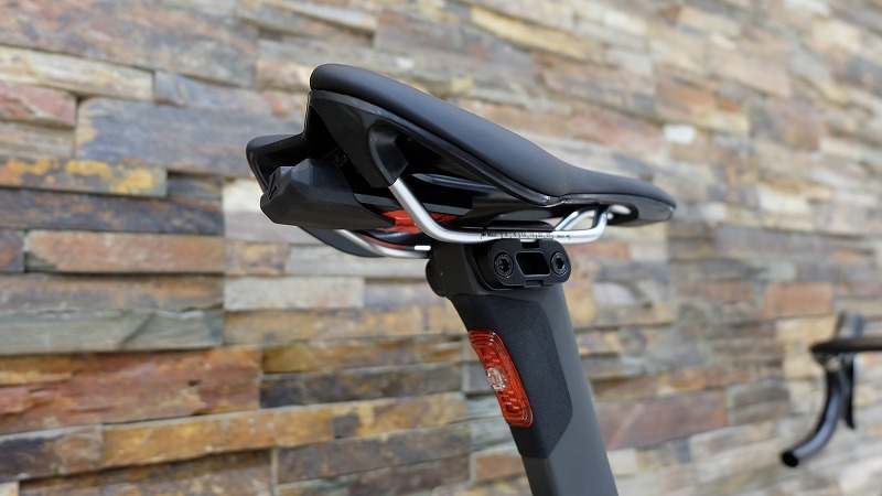 こちらもメリダらしい配慮で、シートポストに内蔵型ライト(取り外し可・乾電池)を装備しているので、電動変速と合わせてフレームはよりスッキリとデザインに。