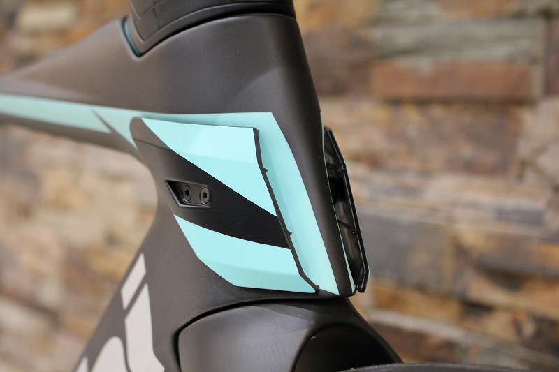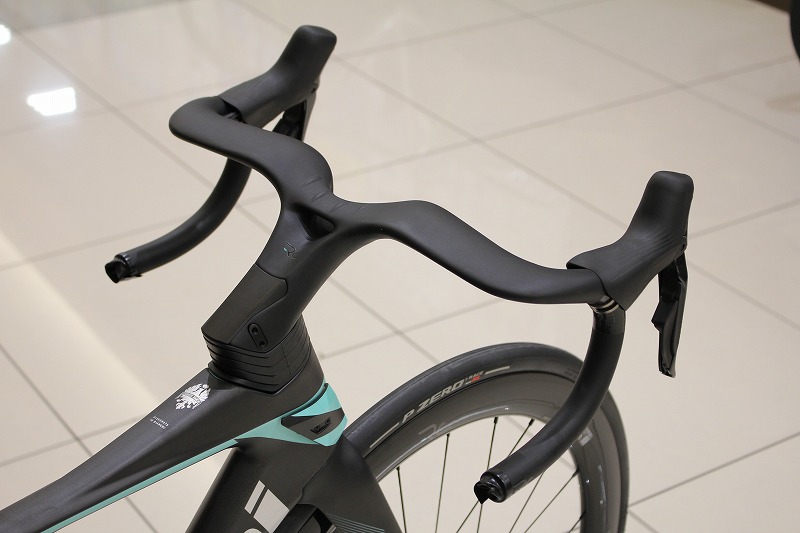 そして空力性能を語るうえで欠かせないのがステム一体型ハンドル。ケーブル類をフル内装化し、ハンドル・ステム・フレームを一体のシステムとして設計することで前方からの空気抵抗を大きく削減しています。空力面だけでなく剛性感の高さやハンドリングのダイレクトさも魅力で、まさにレーシングバイクらしいフィーリングを味わえます。