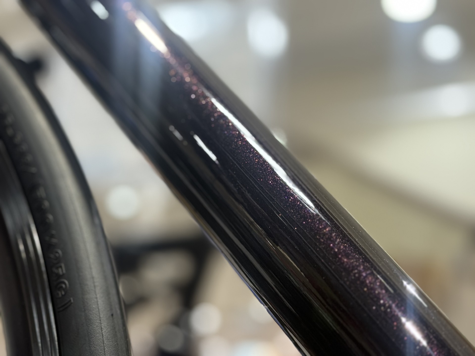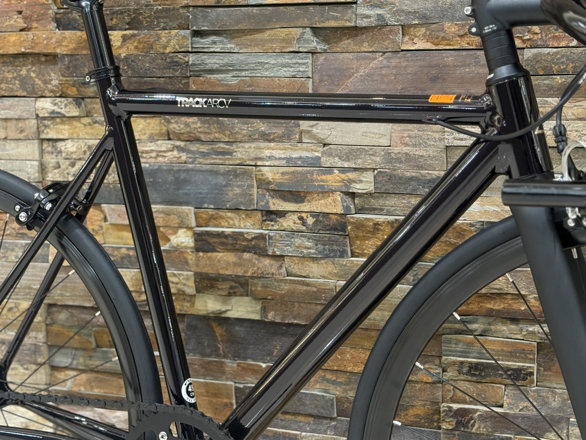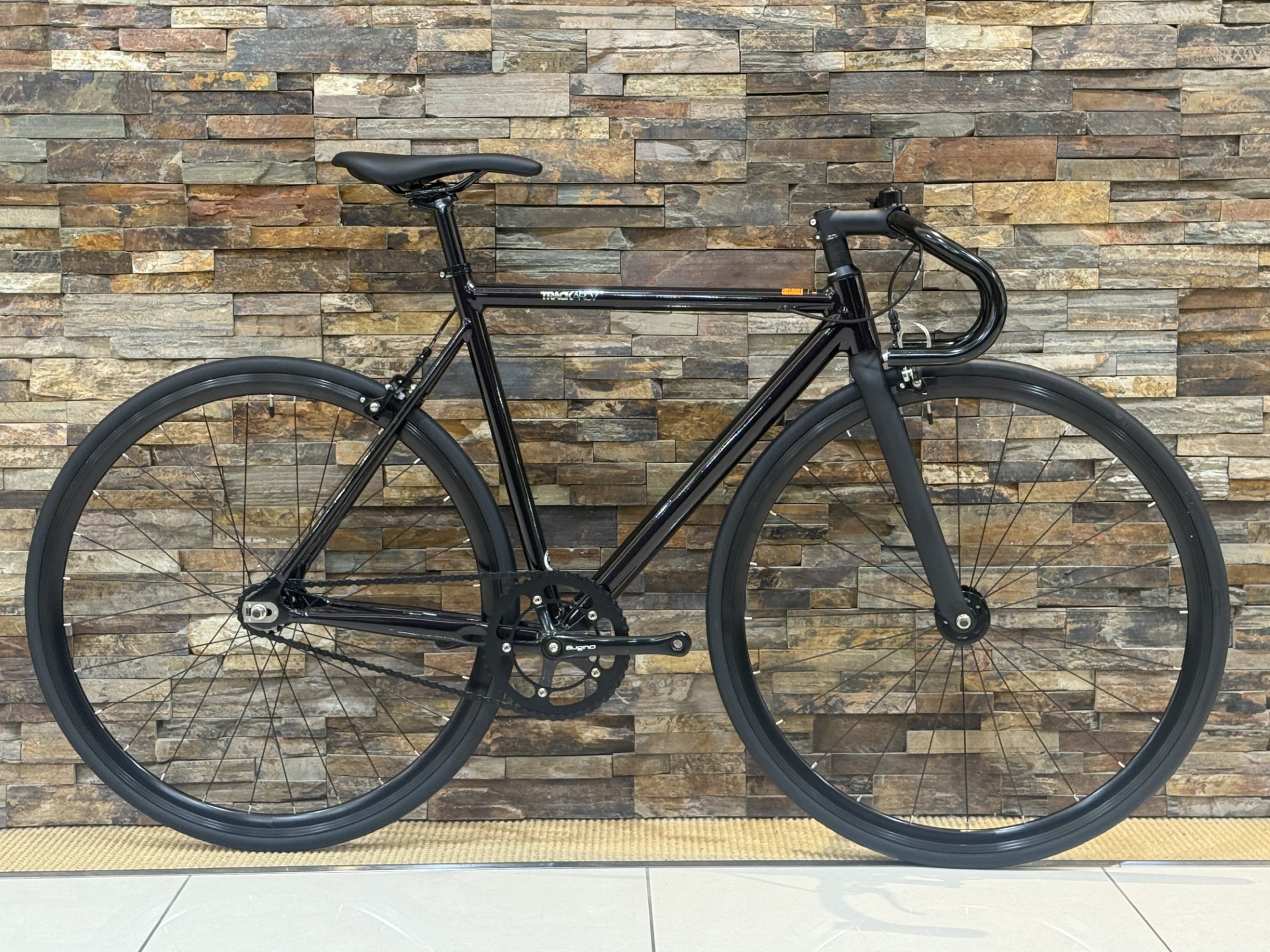 このモデルの魅力は、軽量で剛性の高いアルミフレームです。エアロ形状のダウンチューブとシャープなフレームラインにより、見た目の美しさとスポーティーな走りを両立しています。シンプルで無駄のないトラックバイクらしいデザインも人気のポイントです。今回入荷したカラーは落ち着きのあるクオーツパープル。写真ではブラックに見えますが、実物はしっかりパープルです!光の当たり方によって色合いも変わるので上品でとてもかっこいいですよ。街中でも目を引く存在感があります。