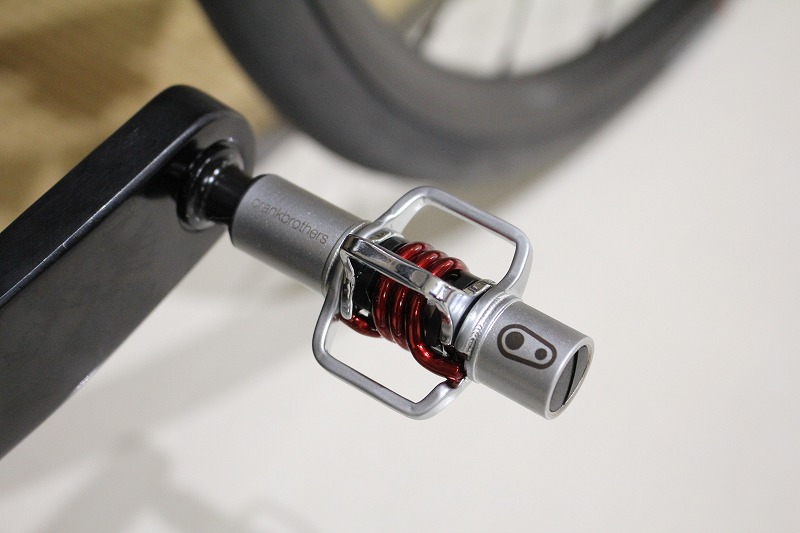 ビンディングシューズも初めてという事なので、ペダルは「クランクブラザーズ エッグビーター1」をチョイスいたしました。さり気ないですが、スプリングカラーとフレーム差し色を合わせてレッドにしています。