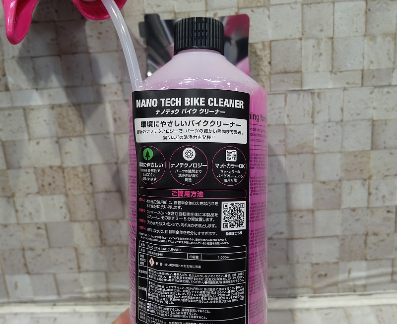 ナノテックバイククリーナーはスプレーして流すだけで汚れを落としてくれる洗剤です。フレームやパーツに優しく、金属パーツやカーボン素材にも安心して使用出来ます。泥・油汚れを強力に分解、スプレーして数分置いて水で流すだけでもOKの簡単洗車。