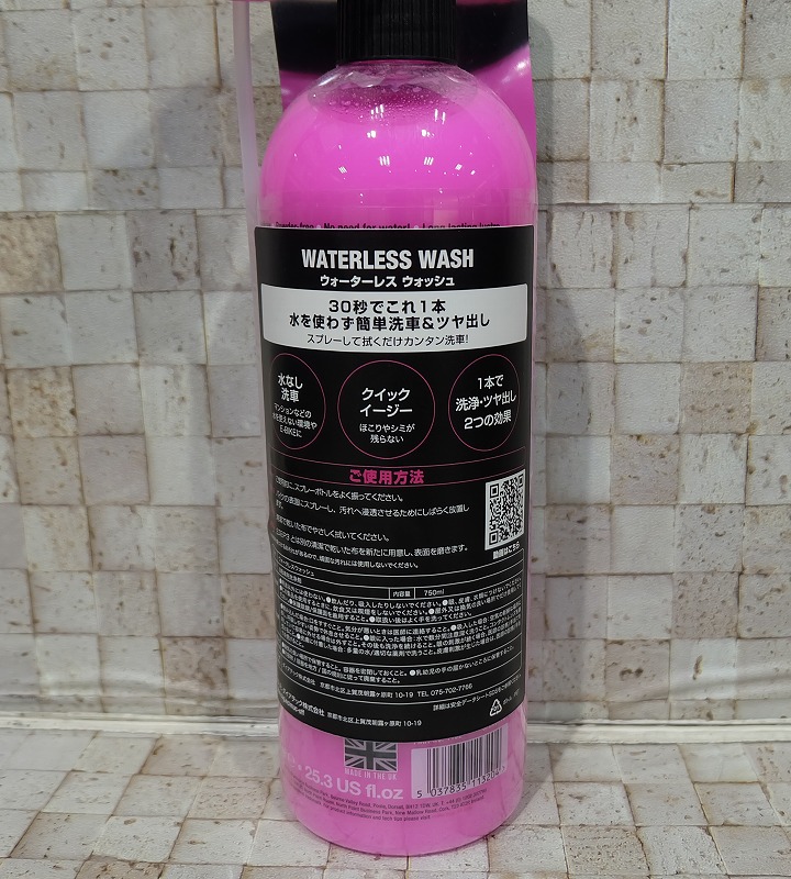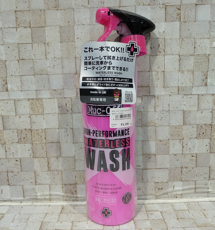 お住いの環境では「水で流せない…」という方も多いですよね。そんな方におすすめなのがウォーターレスウォッシュ。その名の通り、水を使わずに洗車ができるクリーナーです。スプレーして、クロスで拭き取るだけでOKなので2ステップで完結!さらにワックス成分も入っているので、拭き上げるだけでフレームがツヤツヤになるのもポイントです。マット塗装の車体も艶が出ますが、お使いいただけます。タイヤに使用するだけでも非常にキレイになります!ぜひお試しください。