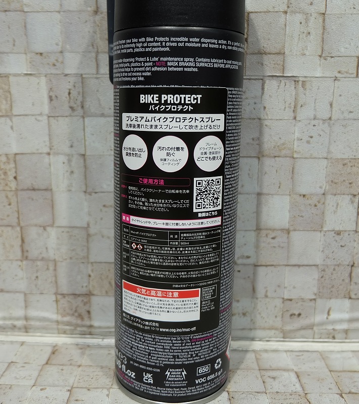 水置換成分で車体に残っている水を排出し、細かい部分にまで入り込んでオイルフィルムコーティングを施します。腐食を防止、汚れもつきにくくなり、金属パーツはサビ防止。タイヤとブレーキ面にはNGですが、車体とドライブトレインにはOKなので、スプレー1つで簡単にコーティングし、出来栄えは驚くほどです。ココナッツっぽい、マックオフ特有の香りがします。