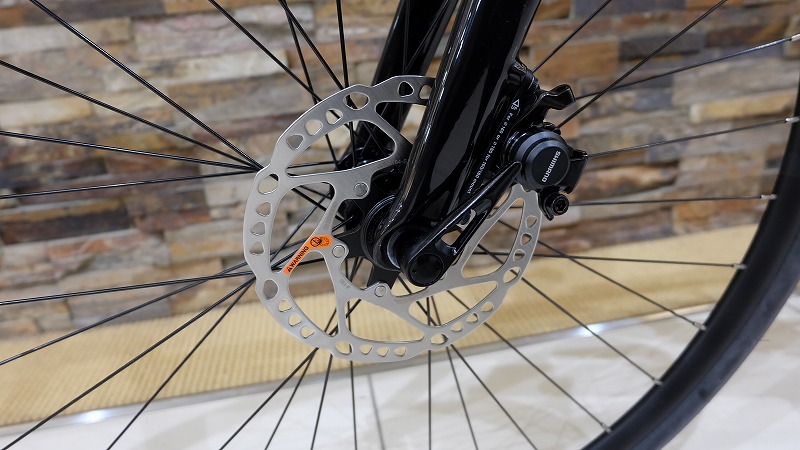 ディスクブレーキはオートバイや車と同じ構造で、スピードの出るロードバイクでもしっかり止まります。天候の影響も受けにくいので、雨の下り坂もあるかもという方は、ディスクブレーキを強くオススメします。
