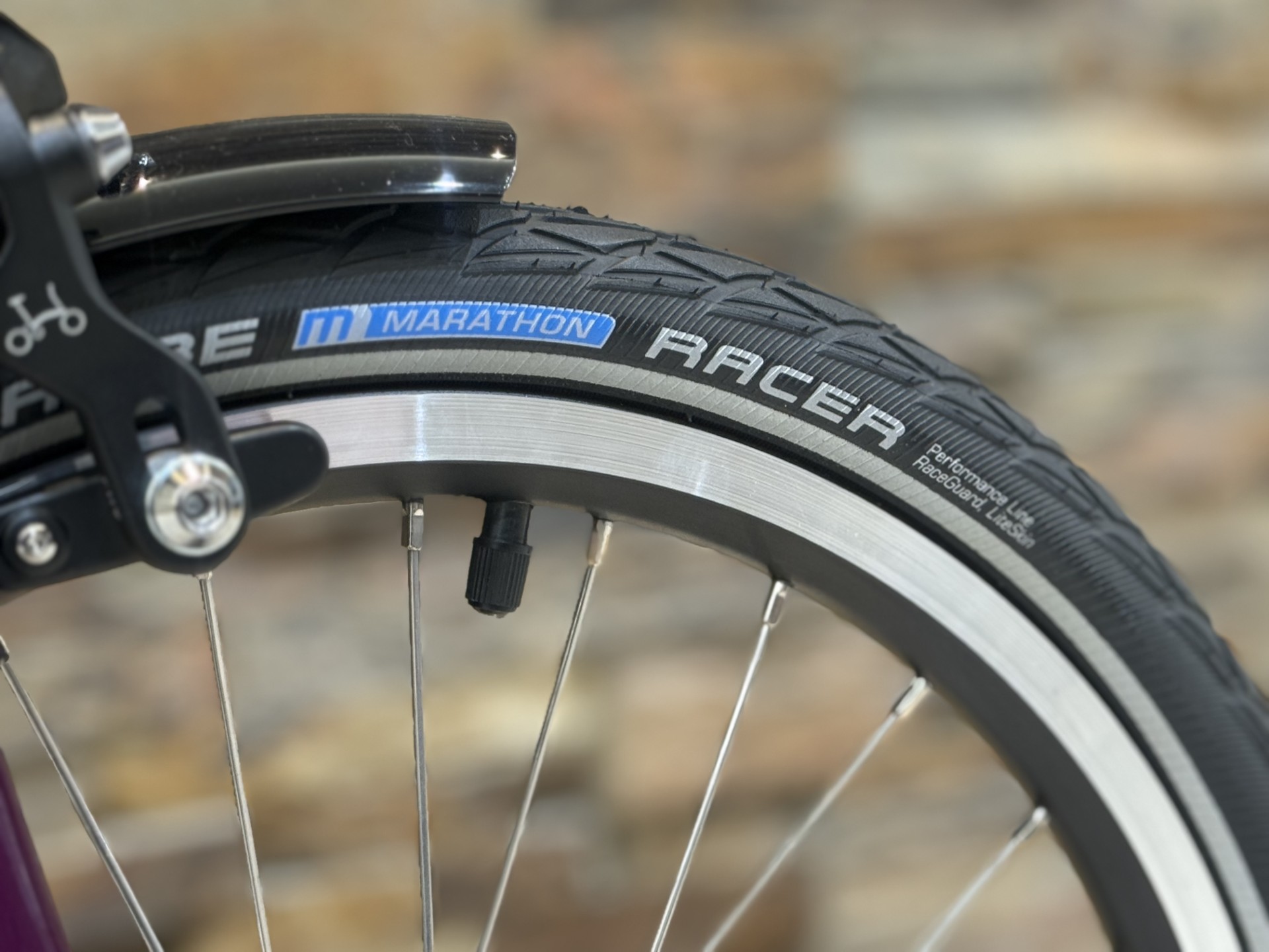 ブロンプトンの良い点は足周りもしっかり楽しめるところ!!完成車タイヤは街乗り用タイヤがついていますが、もっとレーシーに走りたい!!そんな方も16インチロードタイヤなどが出ていますのでしっかり楽しめます。