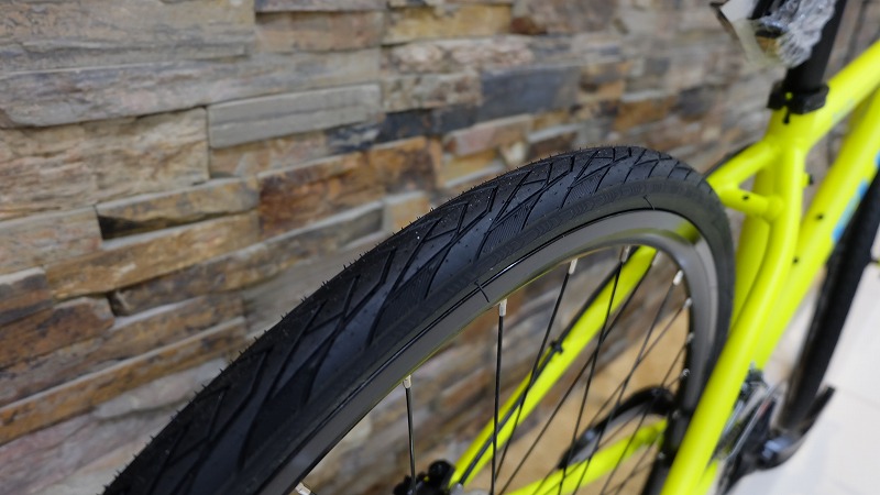 初期装備のタイヤは32c。水はけのいいトレッドが入っているので、雨の日も滑りにくく安心。35cも入るタイヤクリアランス。