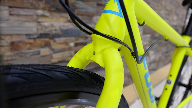 タイヤの上に繋がっているヘッドチューブ部が短く、クロスバイクの中では前傾姿勢がとりやすい設計。アクティブかつスマートなデザインで、ハンドル操作する楽しさもより味わえます。ただ前傾姿勢がとりやすいだけでなく、ハンドルはライザーハンドルを使用して、バランスがとれているので誰もが楽しめる車体に。