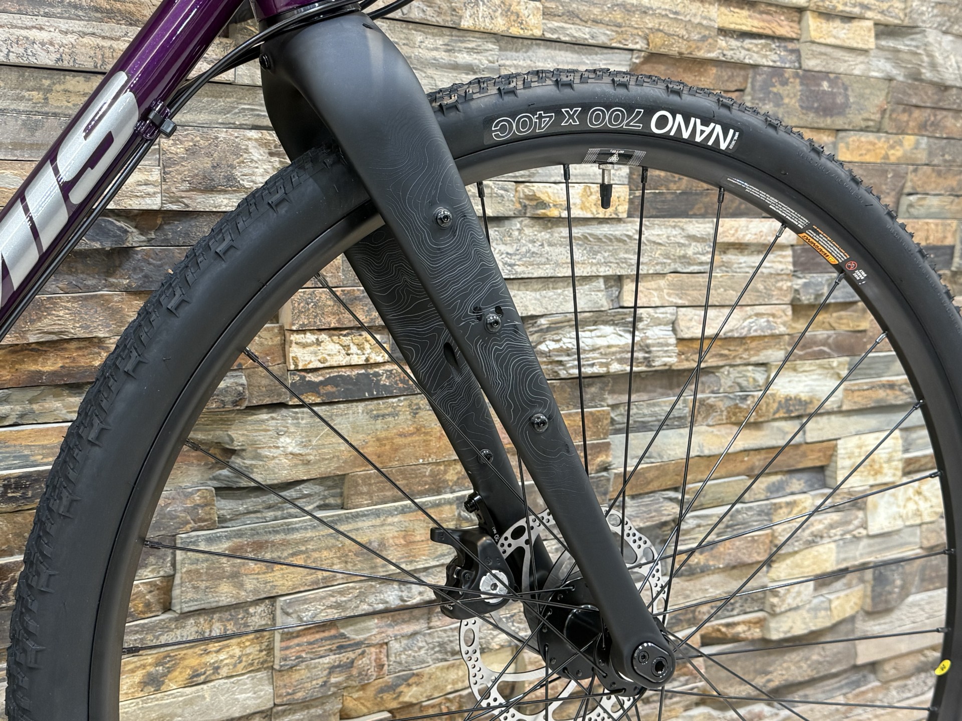 フロントはカーボンフォーク搭載です。フォークがカーボンになるだけで、軽さ・速さ・快適さが全然違います。カーボンには振動吸収性がかなりある為、オンロードもオフロードも安定したライドが可能です。