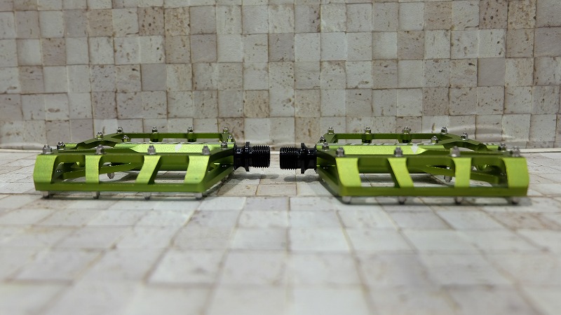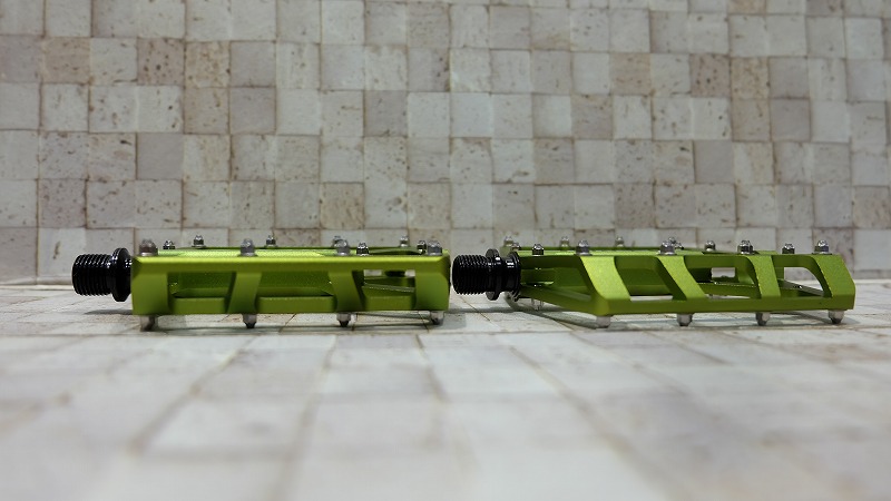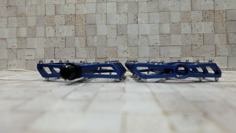 横から見ても、薄く肉抜きも施され、見た目からして軽そう。実物の大きさに反して重量343g。ピンの高さも低めなので、イカツすぎず普段使いもできるバランスのいいペダル。
