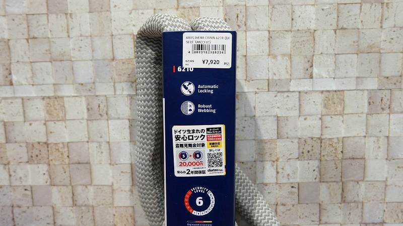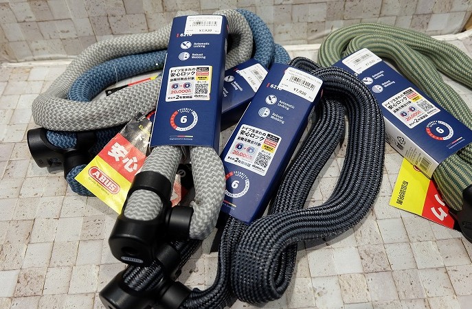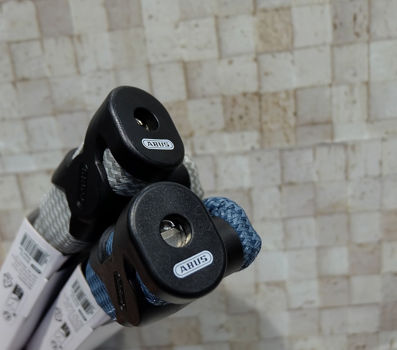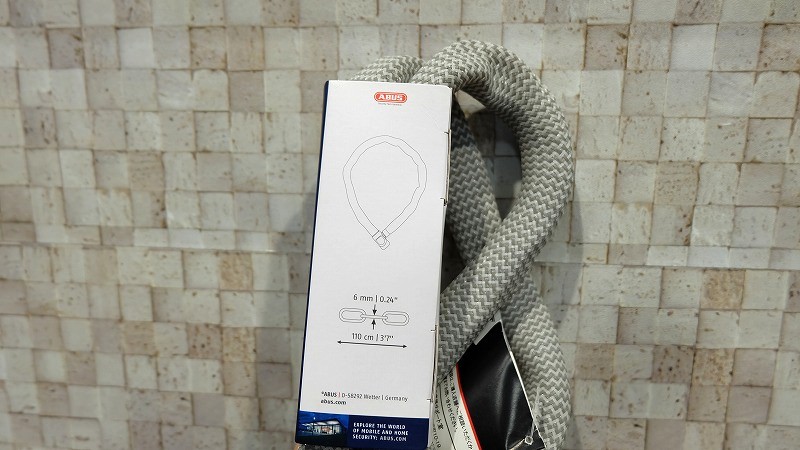 見た目が変わってるのは、新素材IVY TEX。劣化しにくく、車体を傷つけにくい。中身は6mmの焼入れされた角形チェーンで、切断されにくくなっています。信頼のアブスロックなので、性能もばっちり。