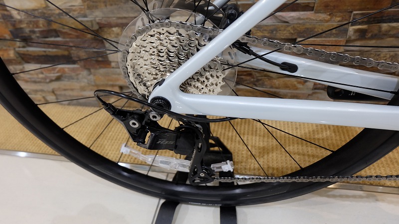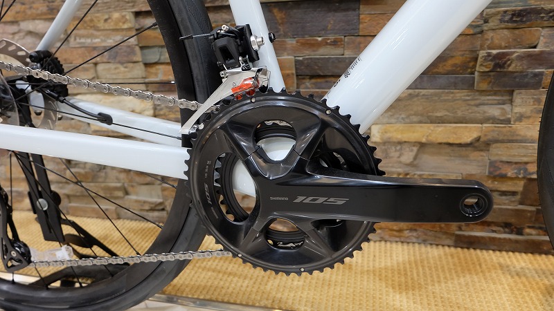 12速の105なので、後のカスタムやパーツ交換もしやすく、チェーンだけのアップグレード、スプロケットだけのアップグレードも楽しいところ。シリアスレーサーでなければ、カーボンフレームで105組は十分なハイエンド完成車。後々、さらに走りを向上となればホイールやハンドルを交換するのもグアッと変わりますよ。