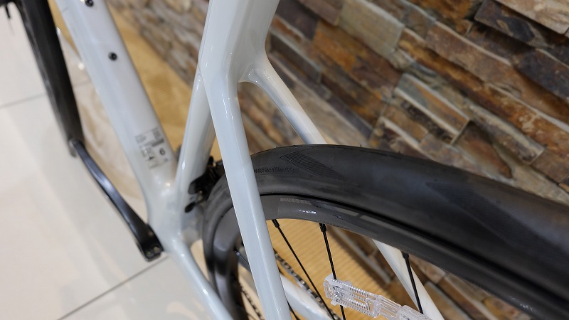前フォークのクリアランスも34cでこんな感じ。35,37cのスリック履かせるとアディクトならではの走行やルックスに。エアロかつエンデュランスでこういった太さはオリジナリティあります。