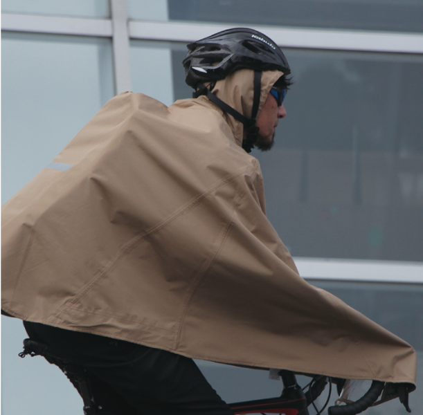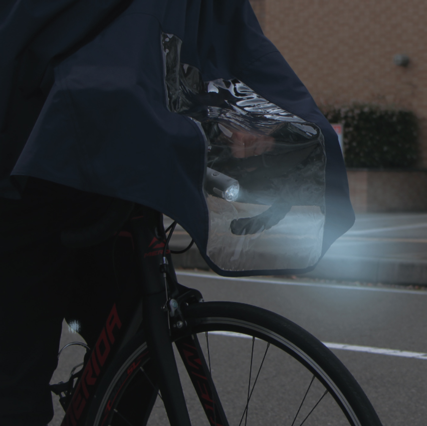 このモデルは一般的なママチャリ用ポンチョとは異なり、スポーツバイク専用設計。ロードバイクやクロスバイクの前傾姿勢でも使いやすいパターンが採用されています。