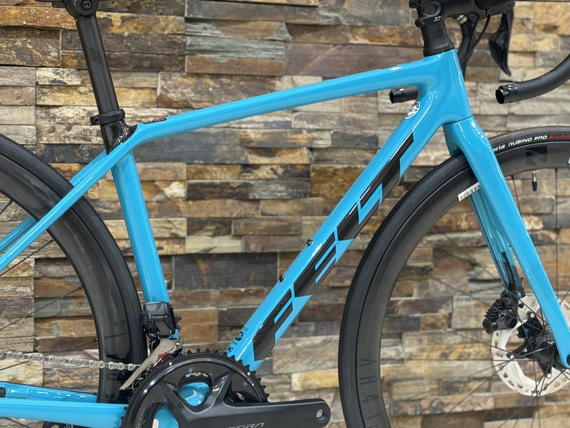 他ブランドの人気モデルは、アルミホイールやエントリーグレードのホイールが装着されているケースが多く、「ホイールは後から交換前提」という仕様が一般的です。その点FR Advancedは、最初からカーボンホイールを装備しているため、購入直後から軽さ・巡航性能・伸びのある走りをしっかり体感できるのが強みです。結果的に後からのアップグレード費用を抑えられます。搭載ホイールは、アメリカ発の老舗ホイールブランドから出ているReynolds/AR41です。AR41は41mmハイトのセミディープリムで、エアロ性能と扱いやすさのバランスが非常に優秀です。ワイドリム設計により快適性も高く、巡航性能だけでなくロングライドや荒れた路面でも安定した走りを実現します。また、リムハイトによって足元が引き締まり、バイク全体の見た目もより一層映えるのもポイントです。