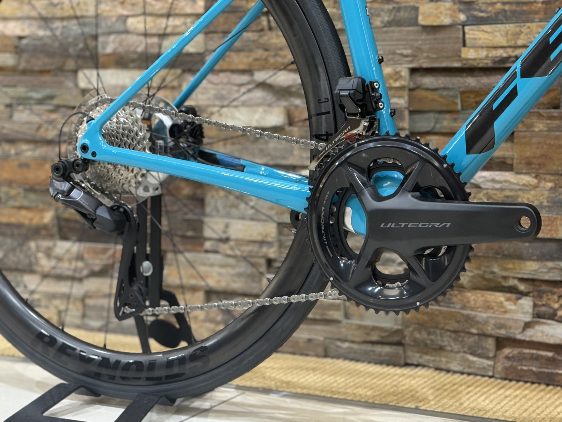 コンパ―ネントは”Shimano Ultegra Di2”を搭載しています。上位モデルの高精度な電動変速により、軽いボタン操作だけで素早く正確なシフティングを実現します。機械式に比べて変速のブレや調整のシビアさが少なく、常に安定した操作感を維持できるのも大きな魅力です。走行中でも狙ったタイミングで確実にギアチェンジができるため、レースシーンはもちろん、ロングライドやアップダウンの多いコースでもストレスのない快適な走行をサポートします。走行性能だけでなく快適性も大きく向上させてくれる仕様です