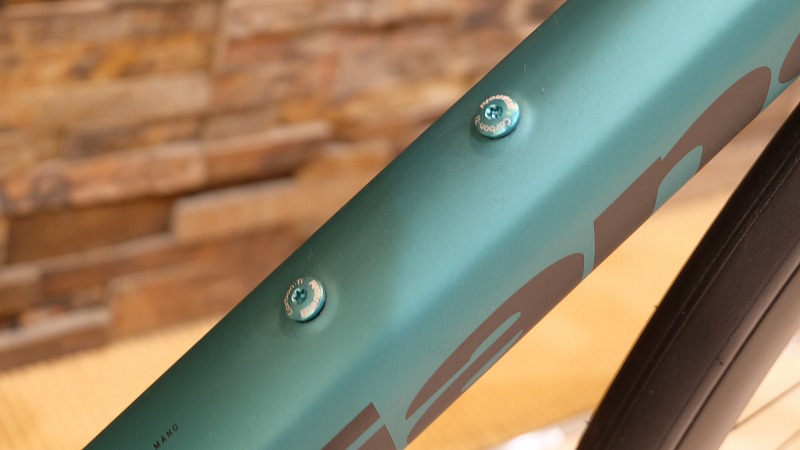 なんと、ボトルケージの取付ボルトがチェレステカラーになっており、カラーの統一感が非常に良いです!