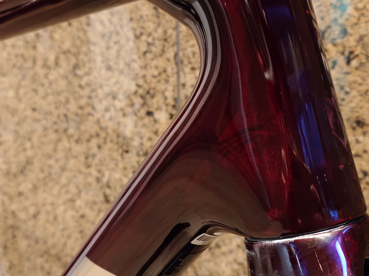フレームカラーはグロスのワインレッドカーボンというカラー。