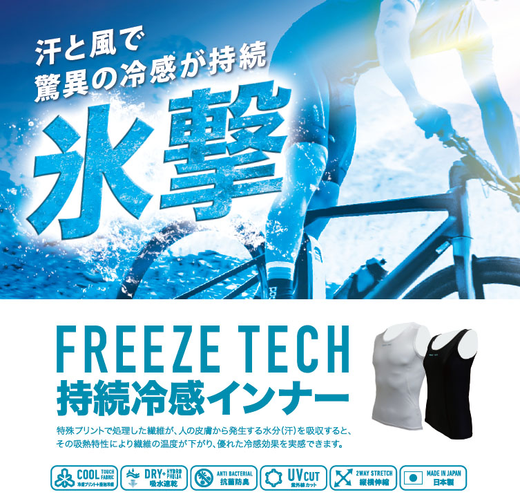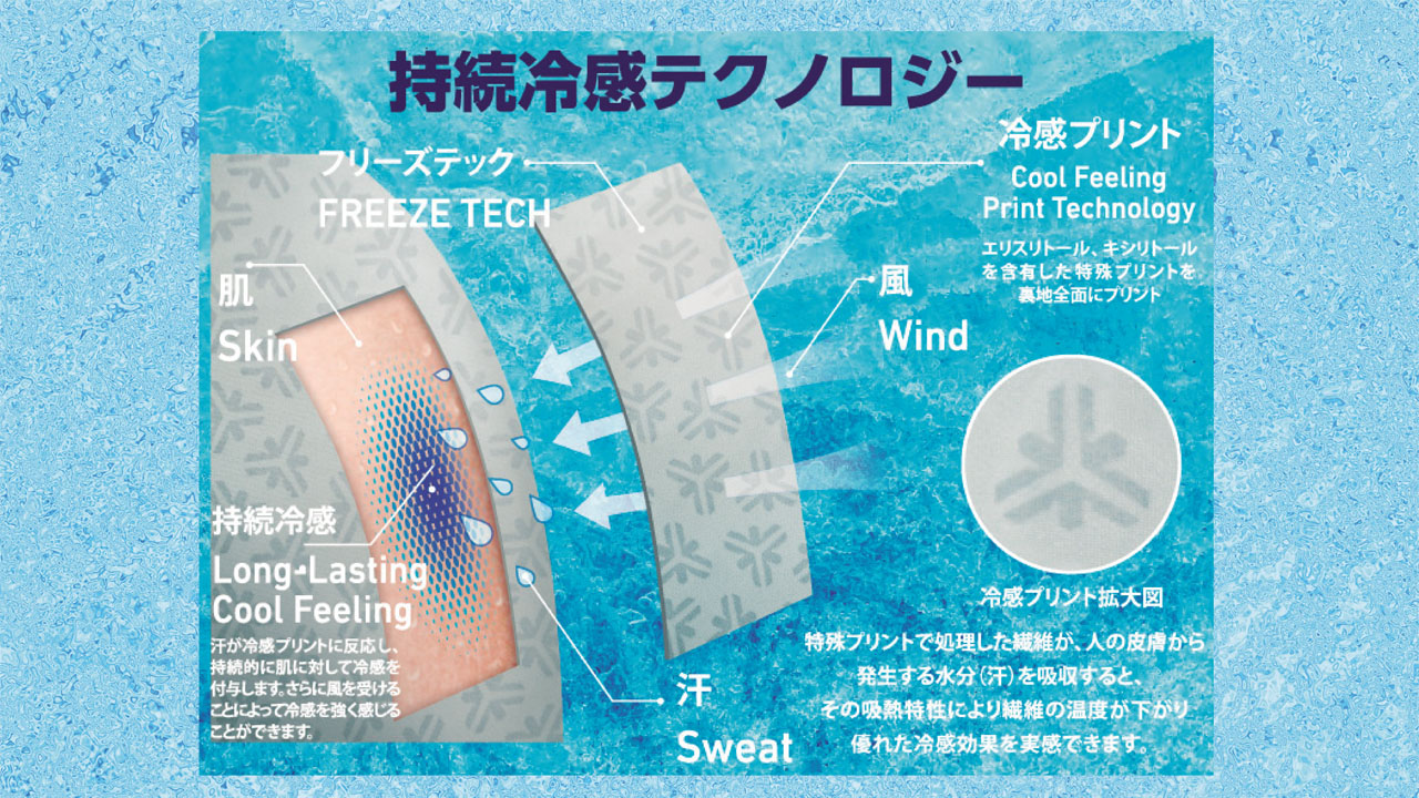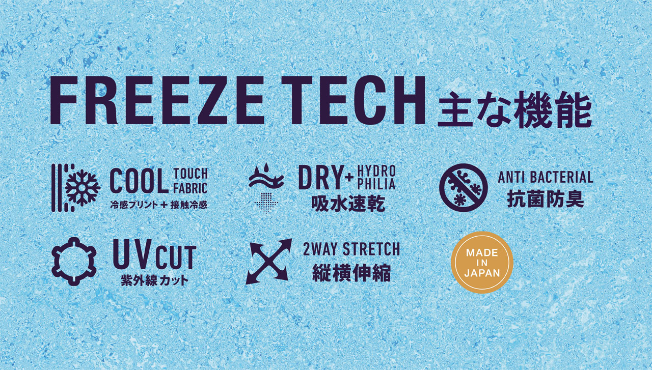 FREEZE TECHは接触冷感生地に加え、裏地全面にエリスリトール、キシリトールを含有した特殊プリントを施しています。
