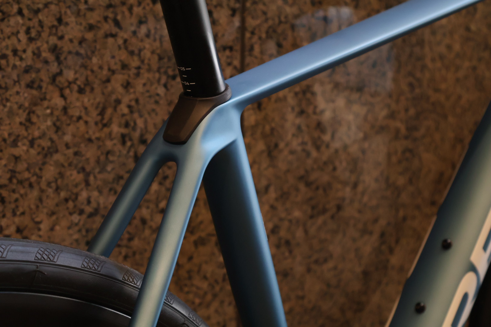 トップチューブは薄めに成形され、横剛性を出しつつ振動吸収性を確保。真横から見たシルエットはすっきりとした印象です。比較的トップチューブが水平よりなホリゾンタルデザインなのも、好きな方にはポイントが高いのではないでしょうか!
