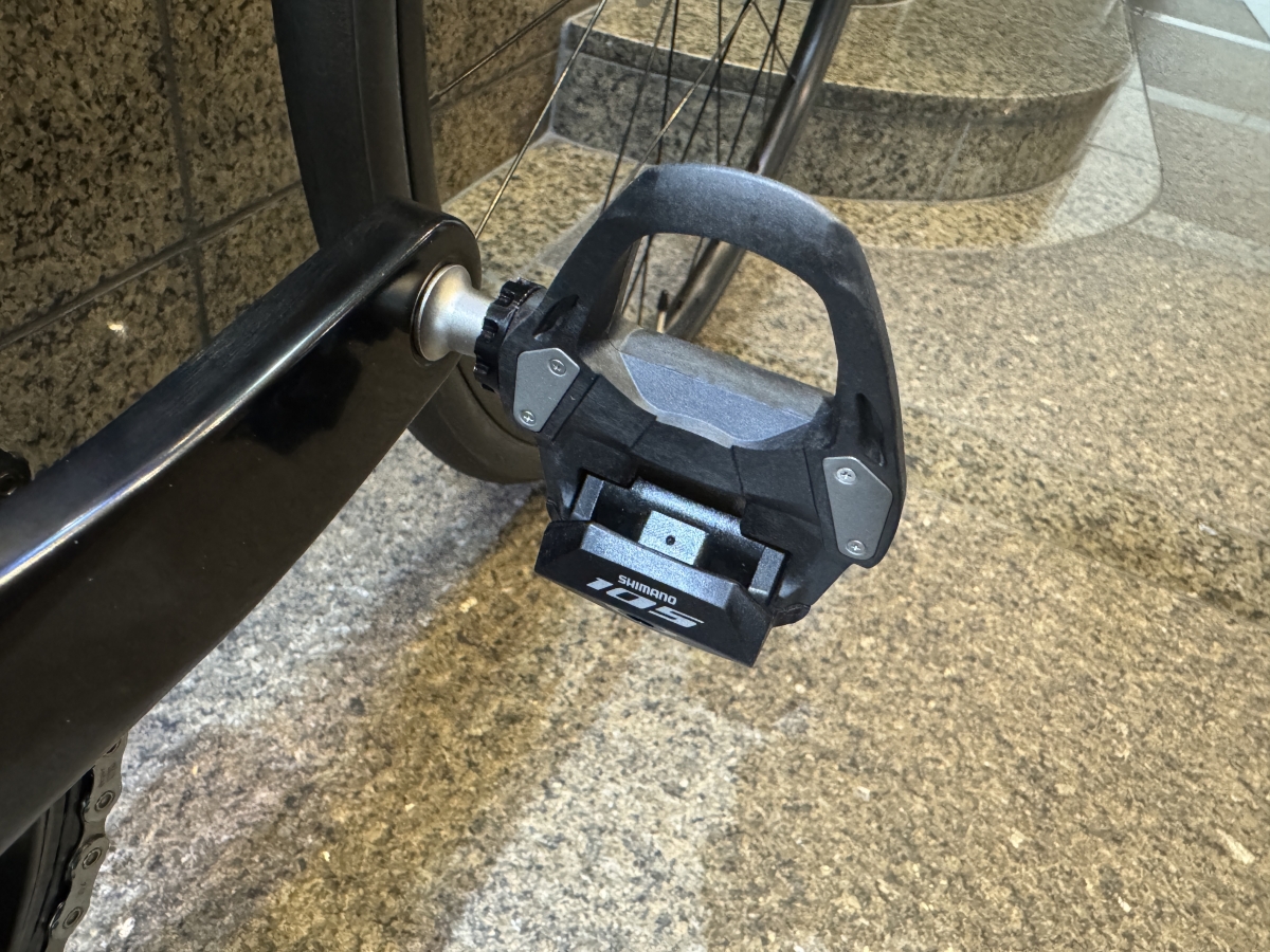 なんとY様、今回のロードバイクでビンディングペダルでデビュー!車体のコンポーネントと同じSHIMANO 105 をチョイス。