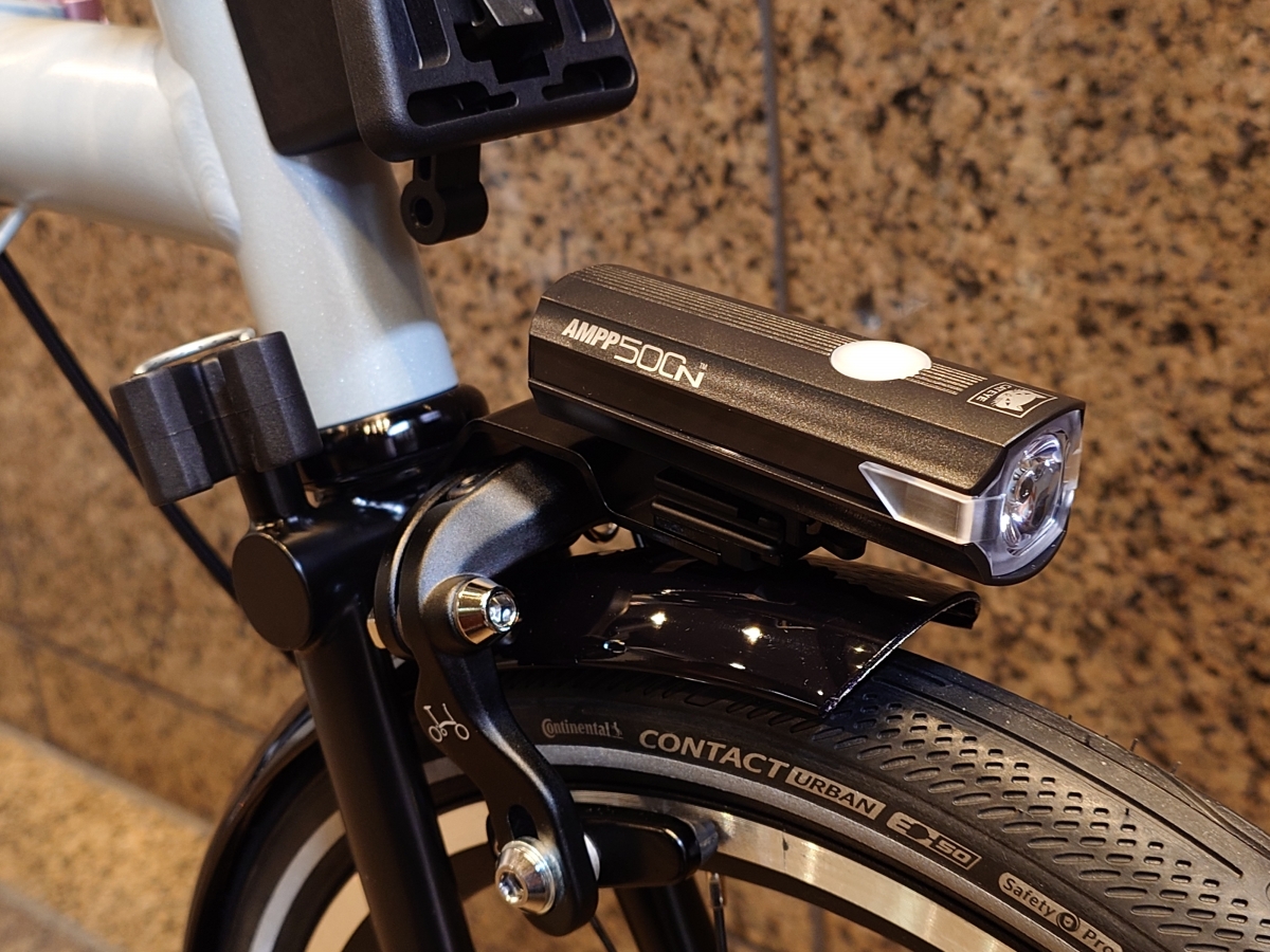 CAT EYE AMPP 500Nにミノウラ フロントライトステーを組み合わせてブレーキ部分にスッキリ取付!