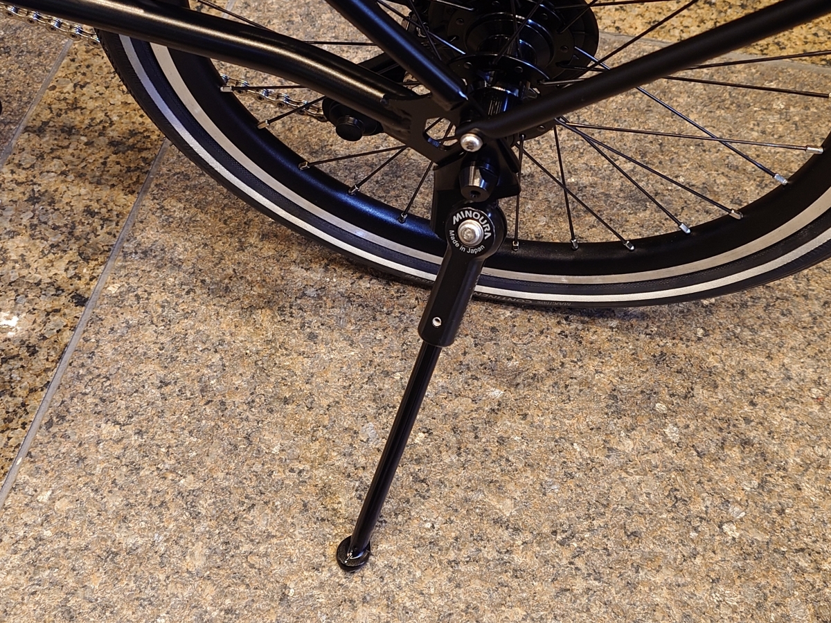 荷物を載せている際は後輪を折りたたんでの駐輪が出来なくなる為キックスタンドも追加。もちろん街中でのちょっとした駐輪にも役立ちます