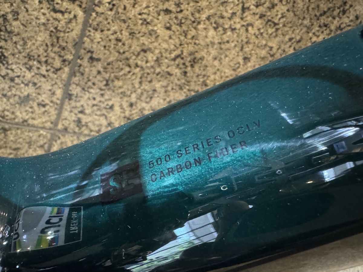 フレームカラーは珍しいグリーン。よく見るとカーボンの地が見えるのがカッコ良いです♪