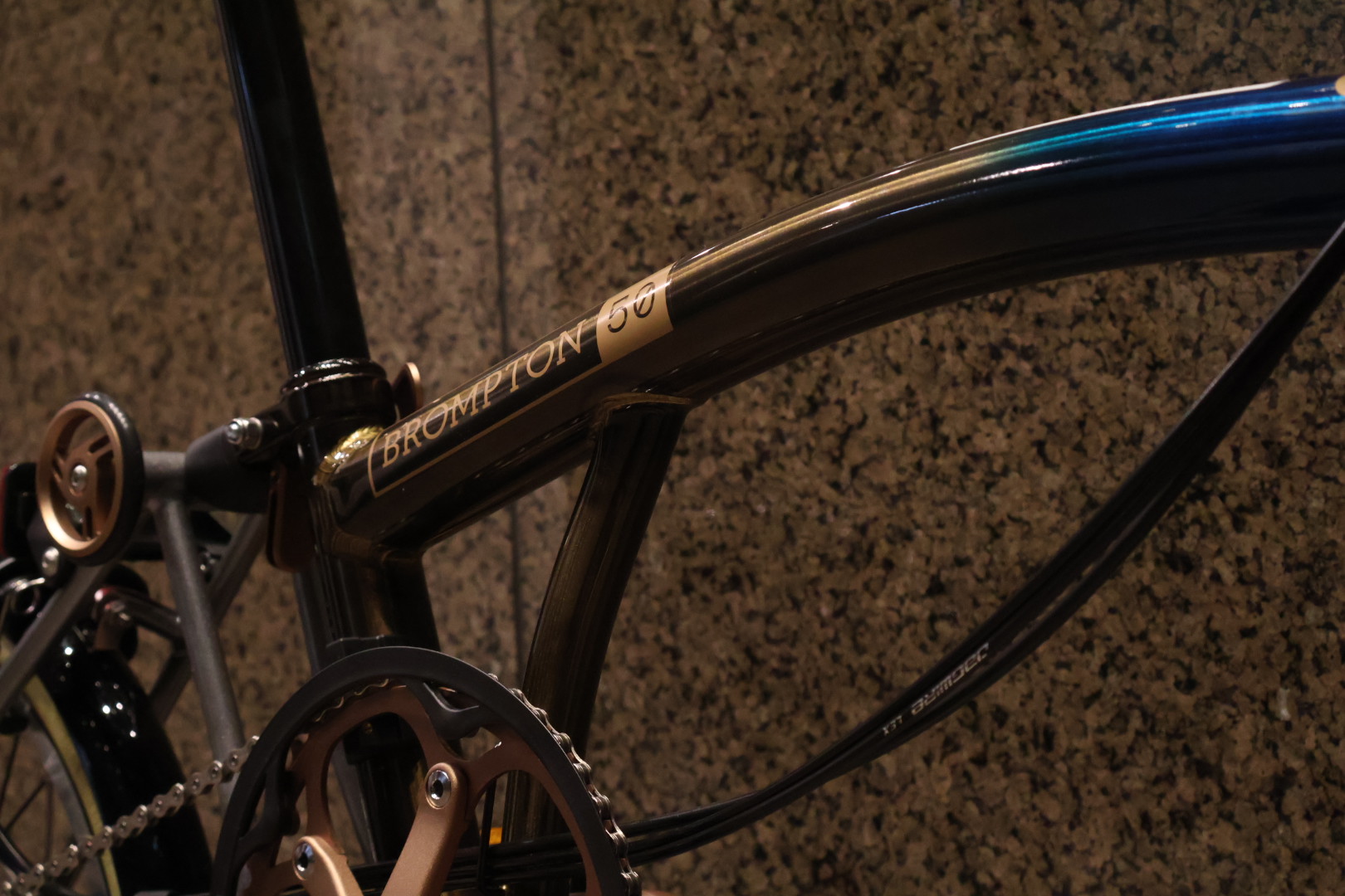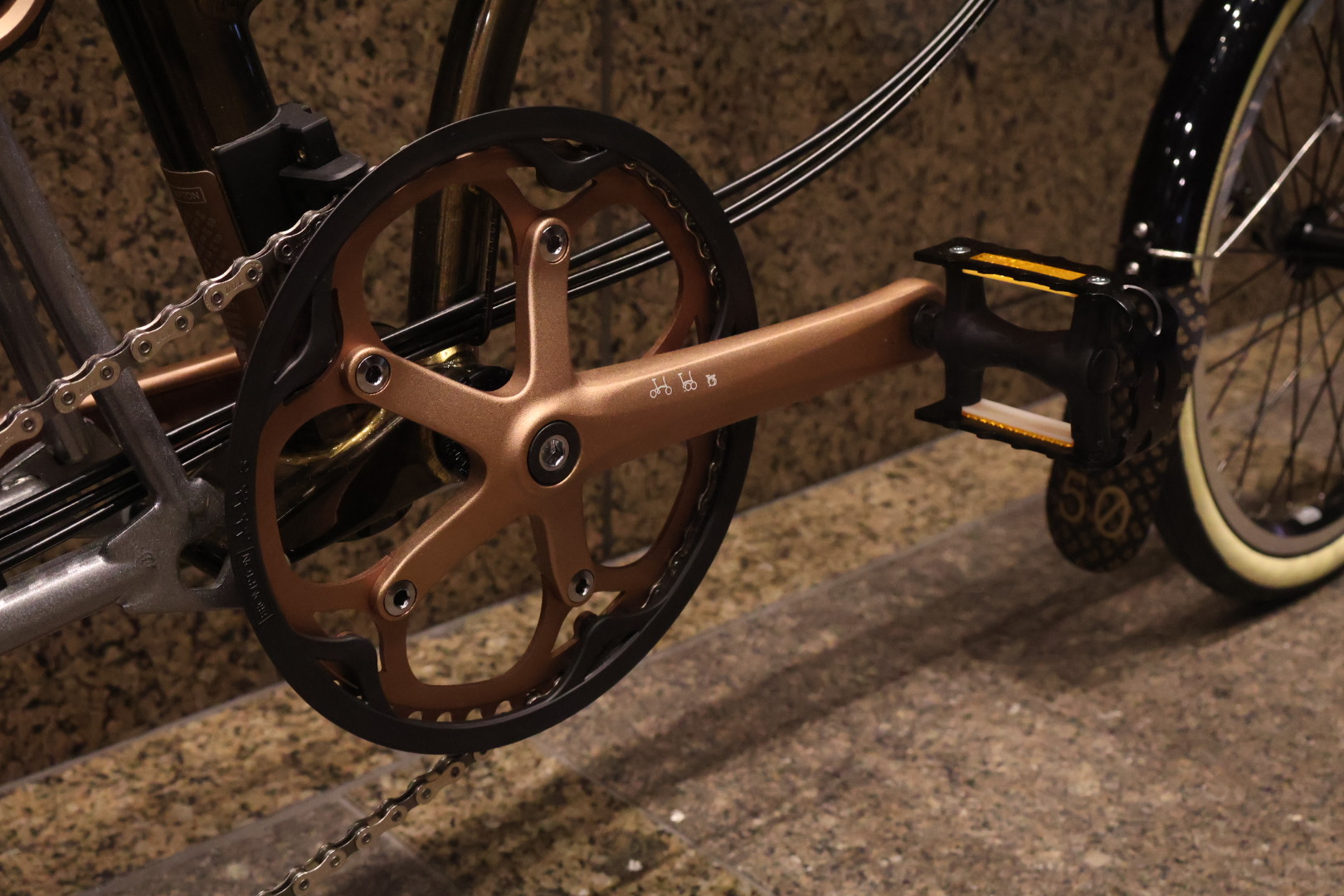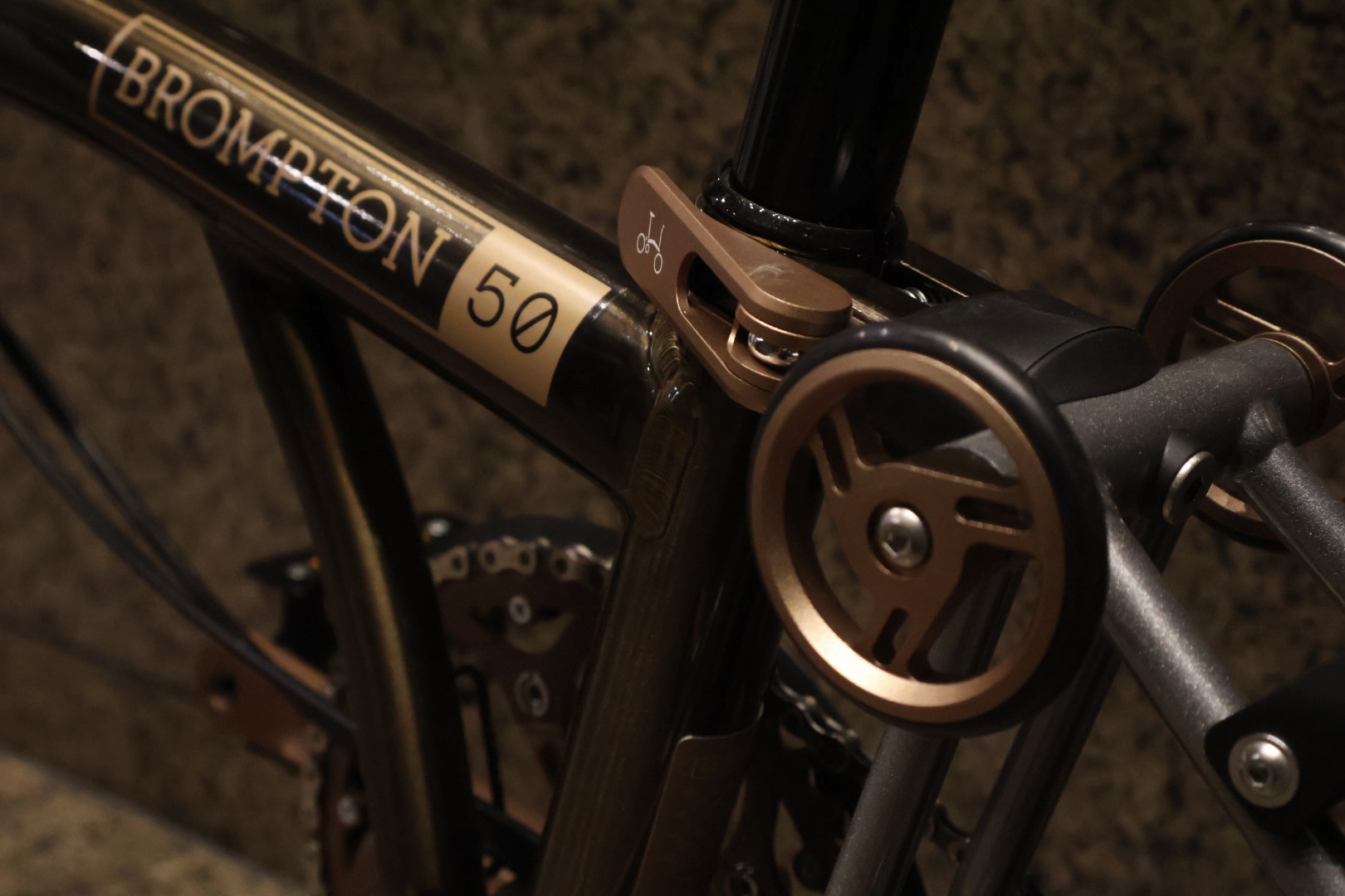 ベルやヒンジクランプ、クランクの他にシートクランプとローラーホイールもブロンズ系のカラーで統一されています。
