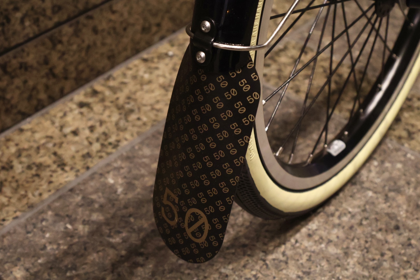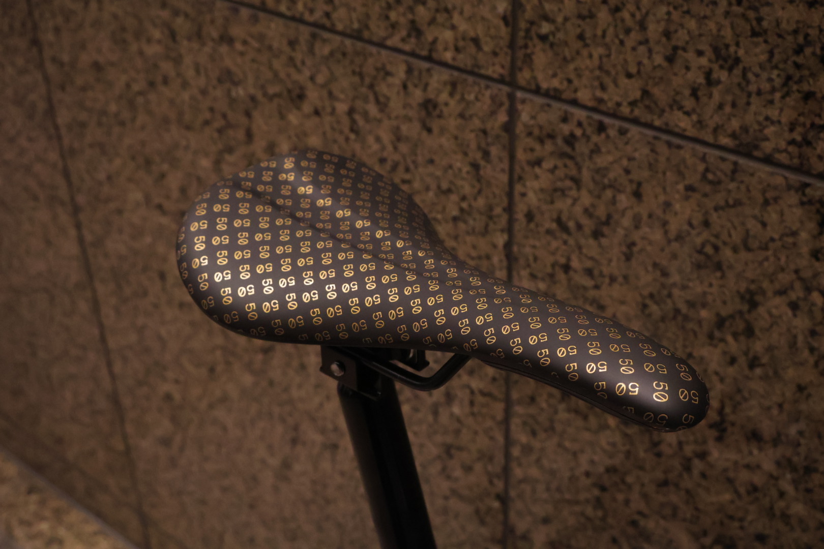 サドルはP LINEに標準採用されているSUPER LIGHT SADDLE ですが、座面はポーチと同様「50」の数字がプリントされたものに。