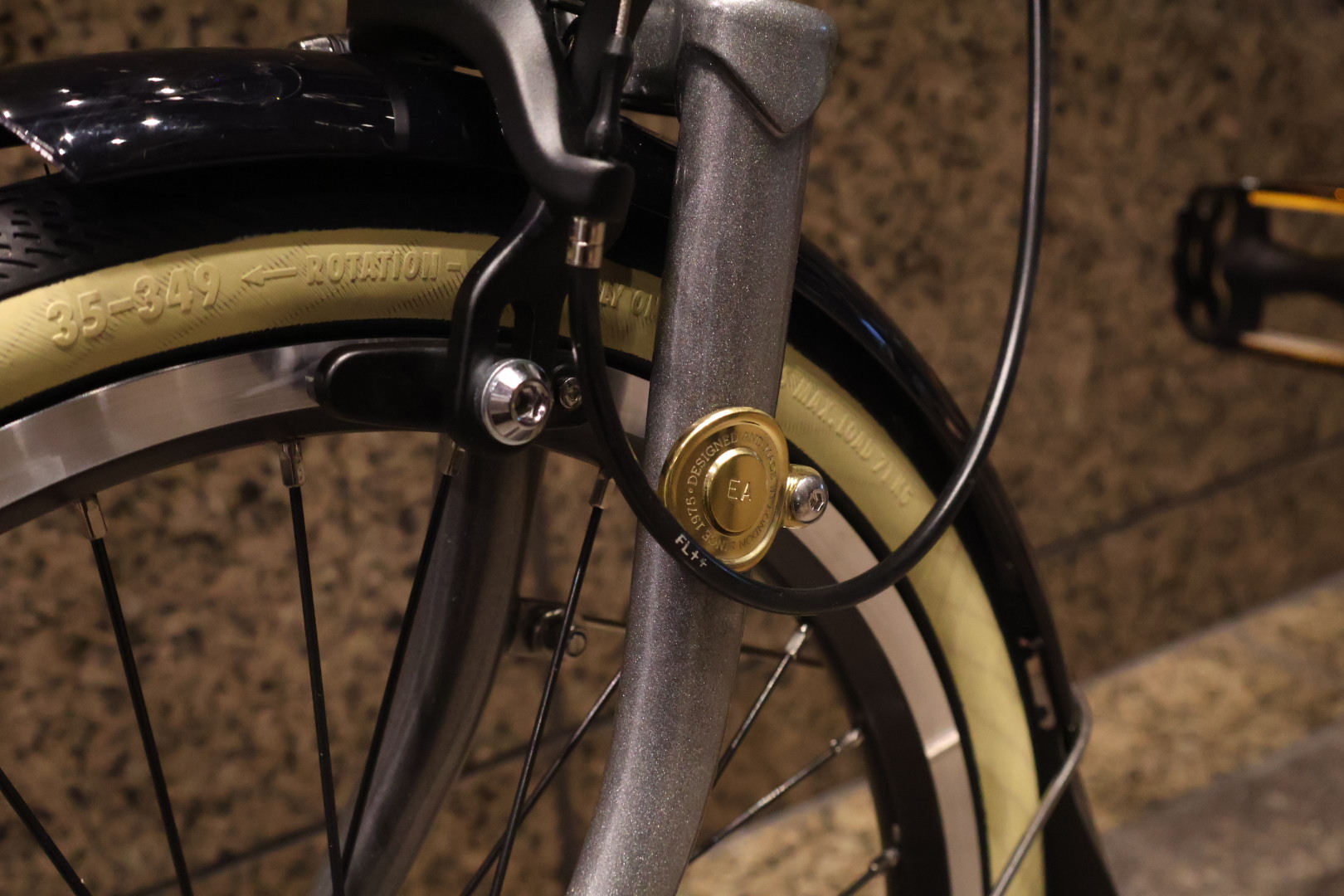 フロントフォークには真鍮のコインが取り付け可能。