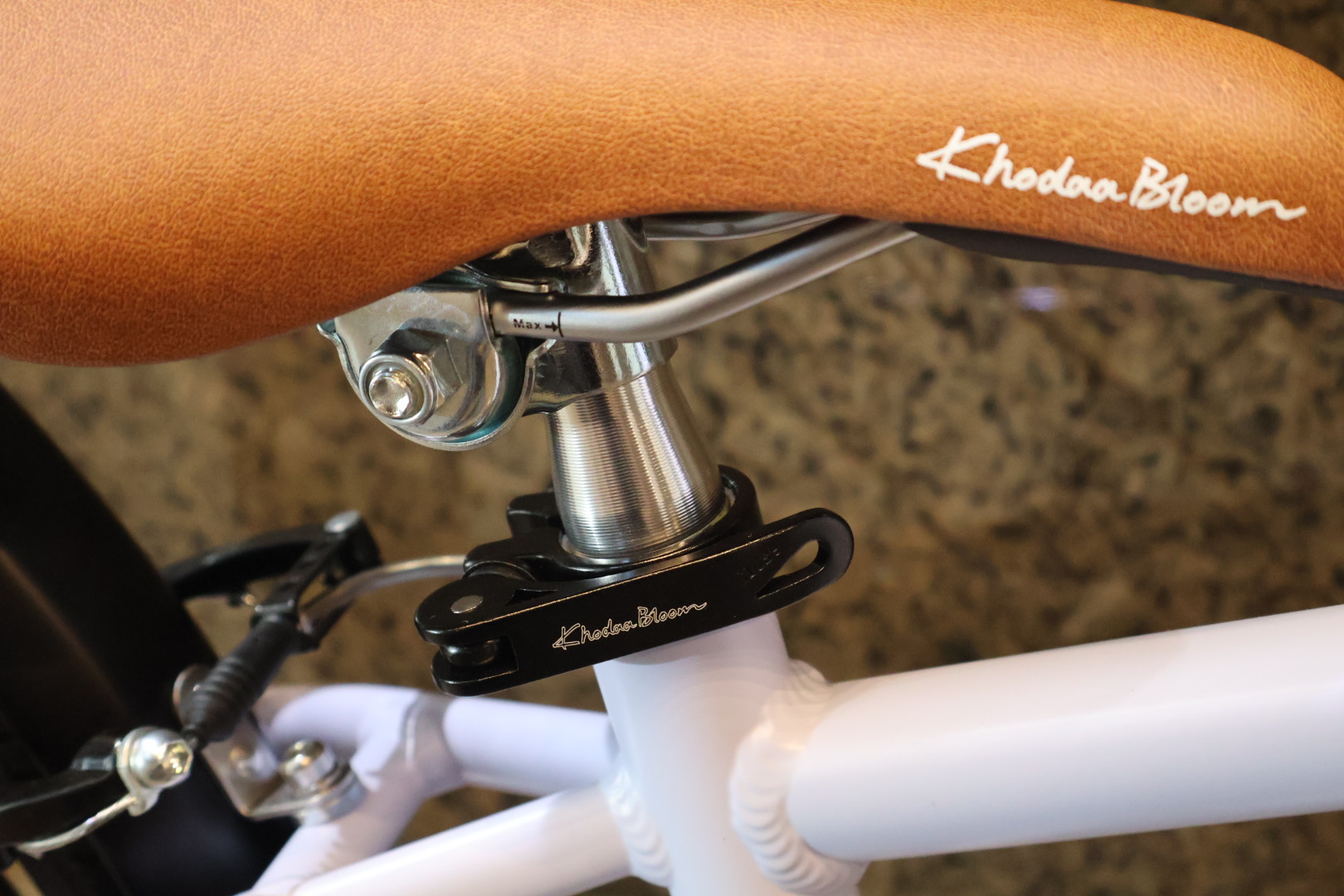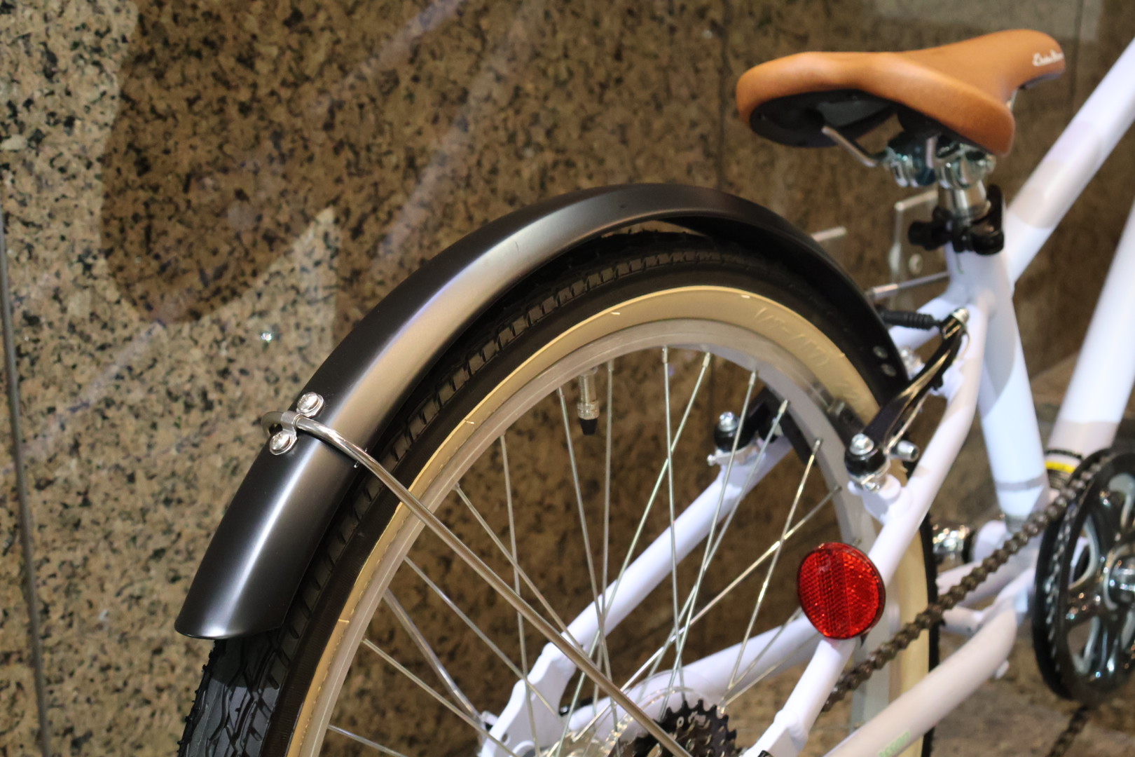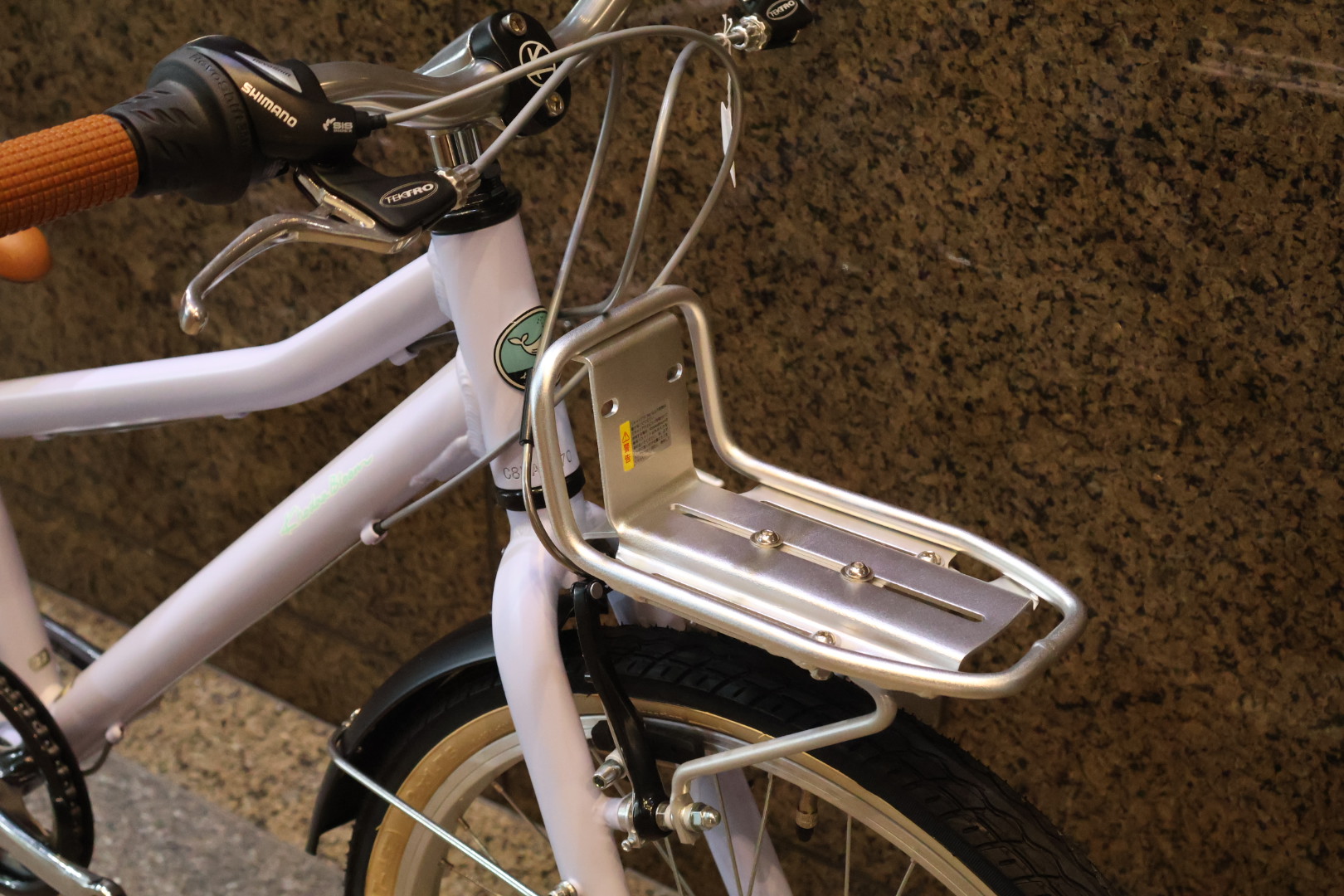 純正付属品としてフロントバスケットマウントや前後フルフェンダー、スタンドを搭載。シートの固定はレバー式で保護者様でも簡単上下調整していただけます。