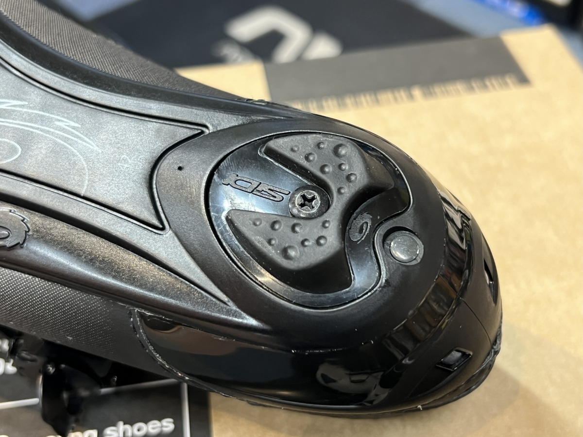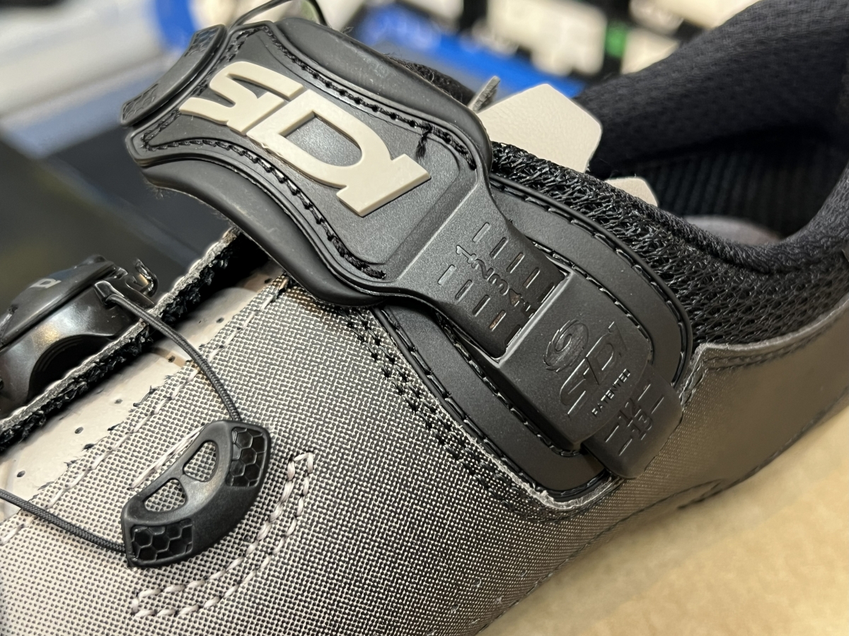 シューズのヒール部分にラバーのすべり止めがついています。フロント側はクリートで支持されていますがかかとはこの部分のみなので、歩行すると結構傷みがでます。SIDIはこのパーツが交換できる数少ないブランドです。長く履きたいと思っている方はもちろん、パンクなどのアクシデントでがっつり歩行してしまったときなど交換ができるのは非常にありがたいと思います。