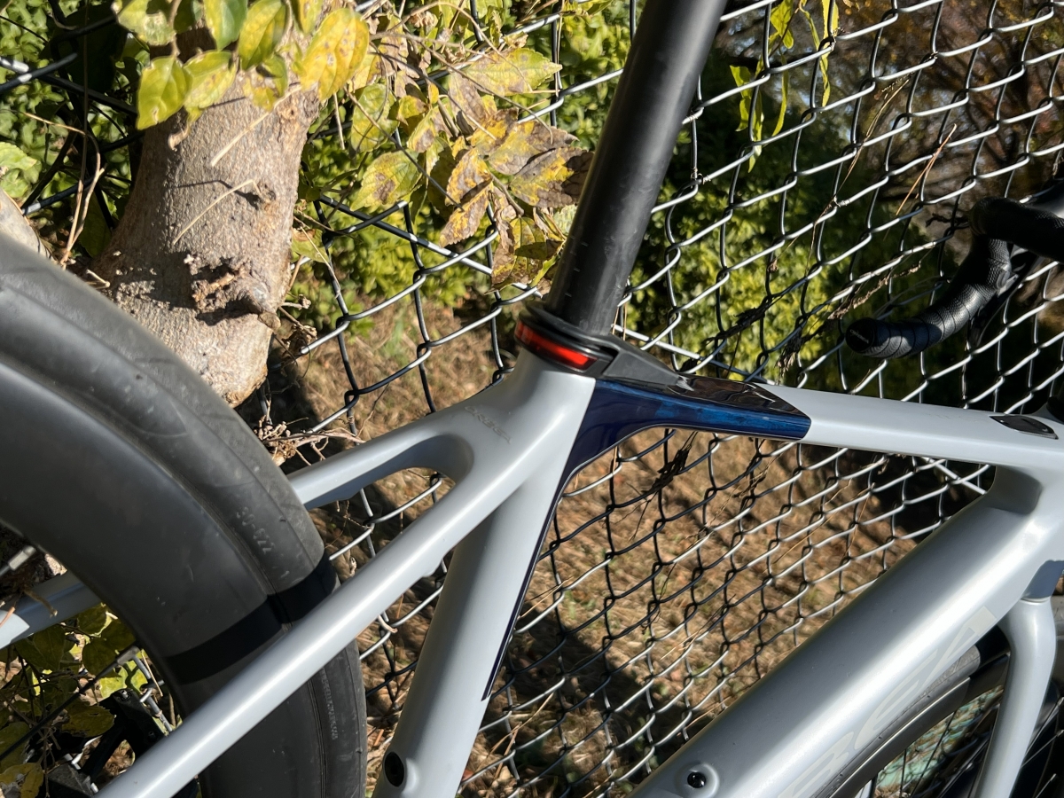 試乗した車両はHalo Silver(Matt) – Blue Carbon View(Gloss)というカラーでメインカラーをマットシルバーに、アクセントになるフォークエンドやトップチューブエンドを濃いグロスブルーで塗装したシンプルでありながらお洒落なテイストになっています。