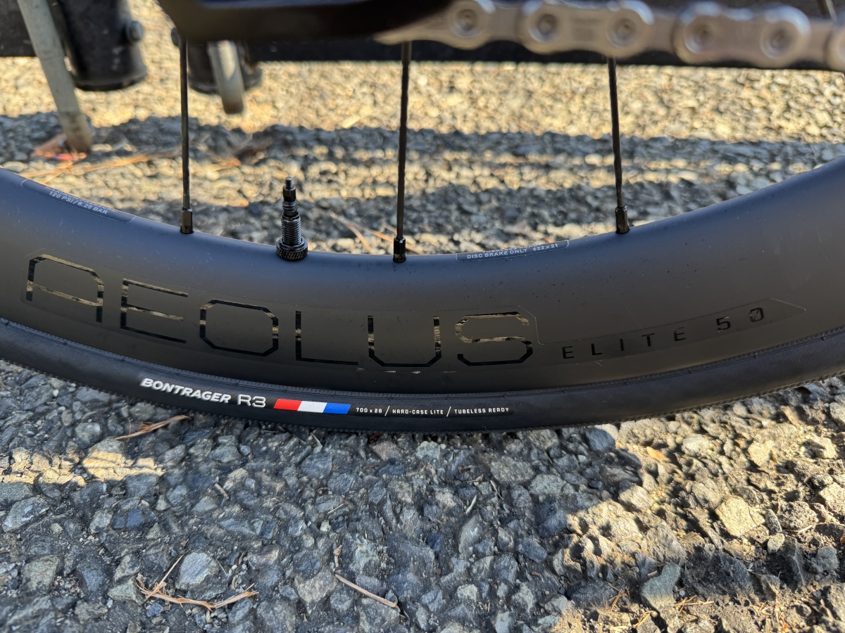 ホイールは2025年モデルと同じくBONTRAGER AEOLUS ELITEを採用していますがリムハイトが35mmから50mmになっていて空気抵抗削減し平坦走行がし易くなっています。何よりディープリムになり見た目もカッコよくなっています。タイヤはボントレガーのチューブレスレディタイヤの28cが装着されています。