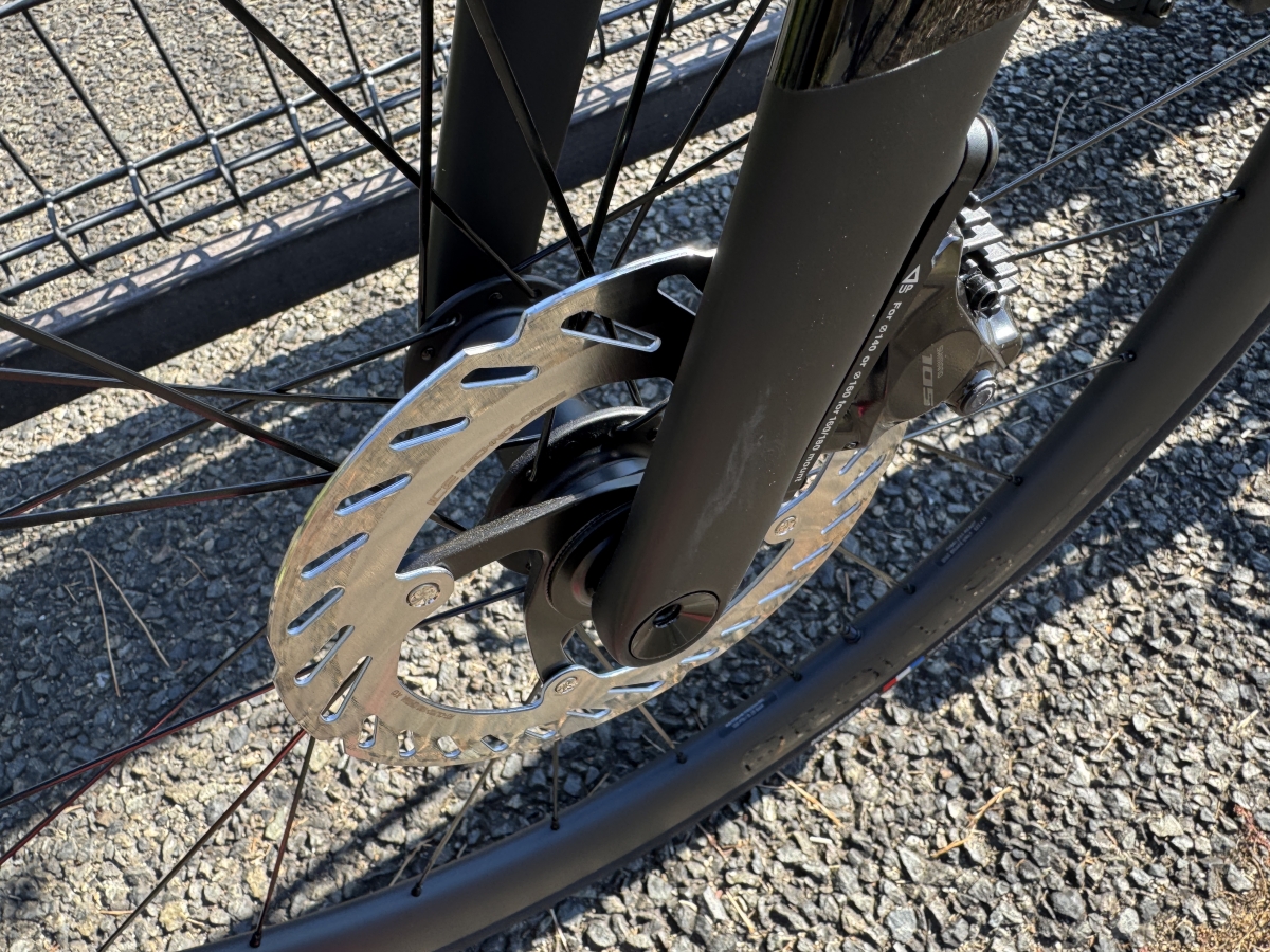 コンポーネントはSHIMANO 105 DI2 R7170シリーズ。2026年モデルからディスクローターが現行105のブレーキキャリパー用に開発されたRT-CL700がアッセンブルされています。今までのディスクローターと比べ最適化された3D形状の合金キャリアがローターノイズがを低減しやすくなっております。