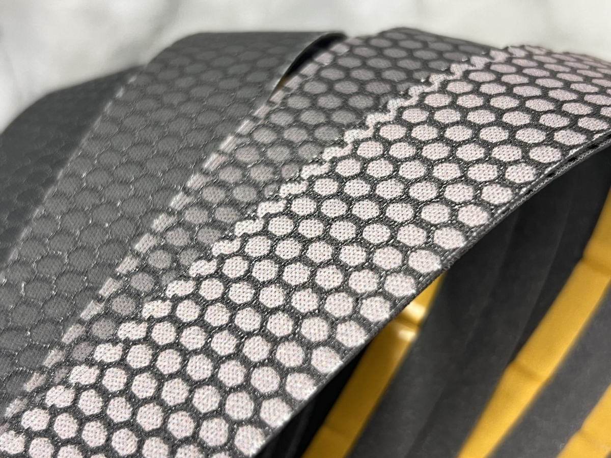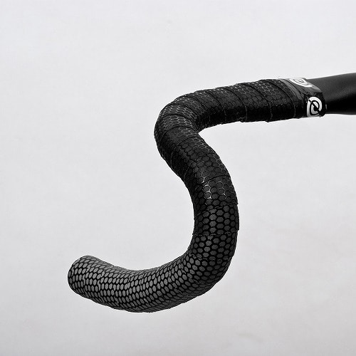 各種ベースカラーにシリコンのすべり止めを施した商品です。ベースカラーはグラデーションで、選んだカラーからブラックにシフトしていきます。ハニカムデザインはバーエンドからアッパー部分までテープ全体が同じデザインで統一されています。テープ厚も2.3㎜と一般的なものなので幅広い用途にご利用いただけると思います。
