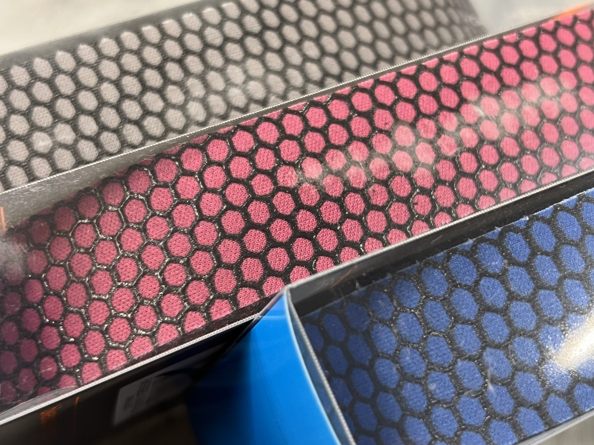 このテープの重要な要素(?)のすべり止め部分が成型不十分でシリコンによるグリップがほとんど得られない状態です。凹凸感もほとんどなくデザインの一部になっています。テープ自体に不良はないので、デザイン重視でご検討いただければ幸いです。