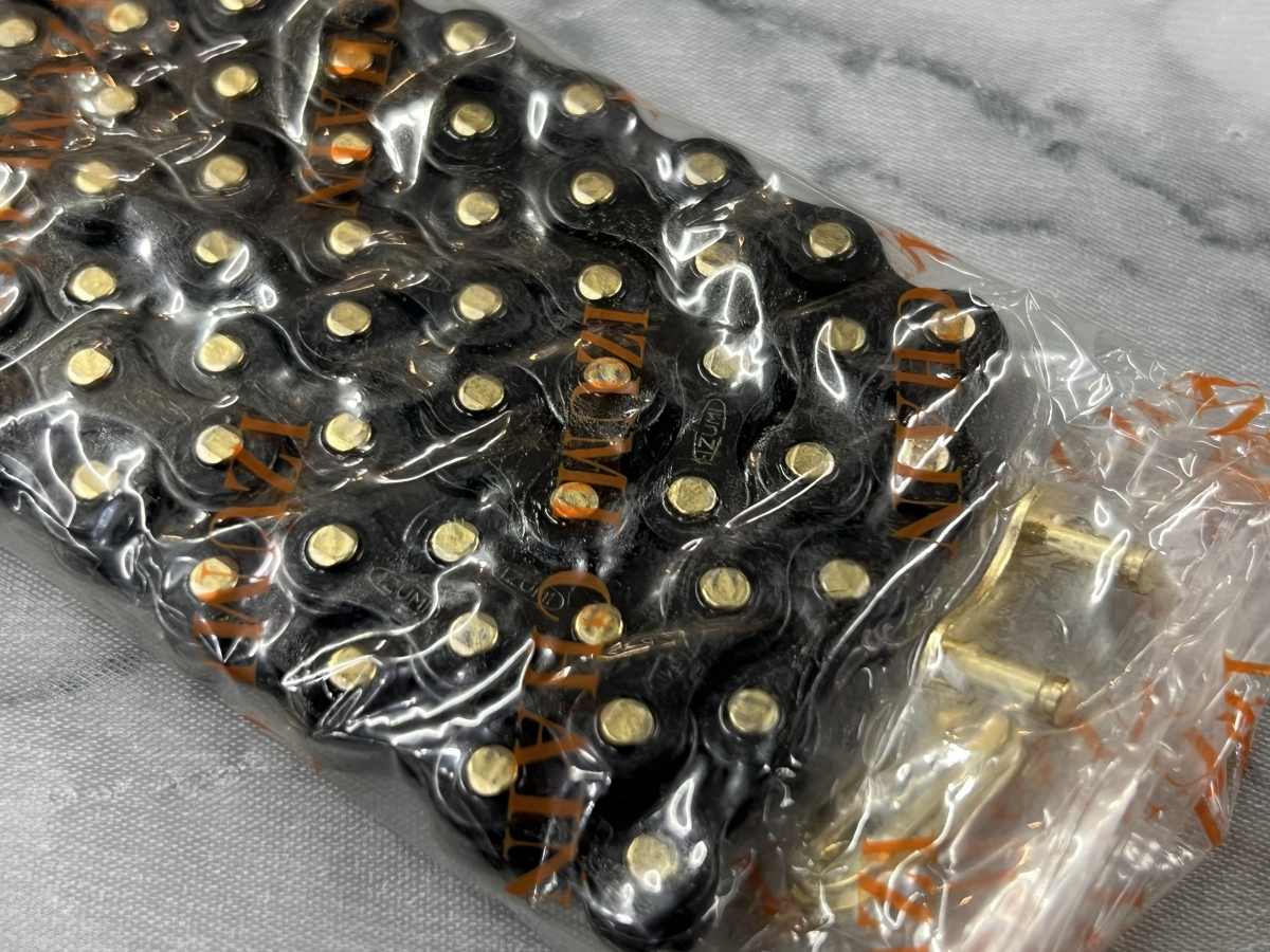 インナー・アウターのプレートはオールブラックで統一されたこのモデル。それを繋ぐピンはゴールド仕立てで駆動部にさりげないアクセントを持たせています。あまり派手にしたくないけれど、交換するこのタイミングだからほんの少し冒険してみようかな…そう思わせるような丁度いいバランスのカラーとなっています。チェーンを繋ぐリンクパーツはプレート全体がゴールドの仕様となっています。