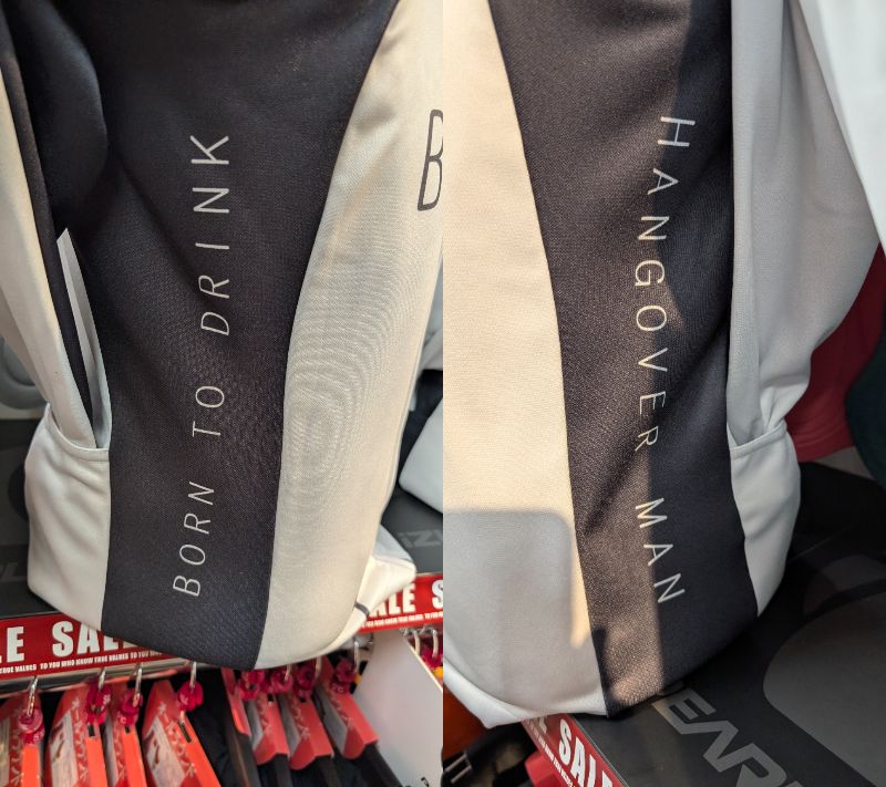 サイドにはBORN TO DRINK(呑むために生まれた)、HANGOVER MAN(二日酔い野郎)の文字。